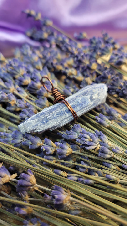 Wire wrapped blue kyanite crystal necklace with snowflake charm