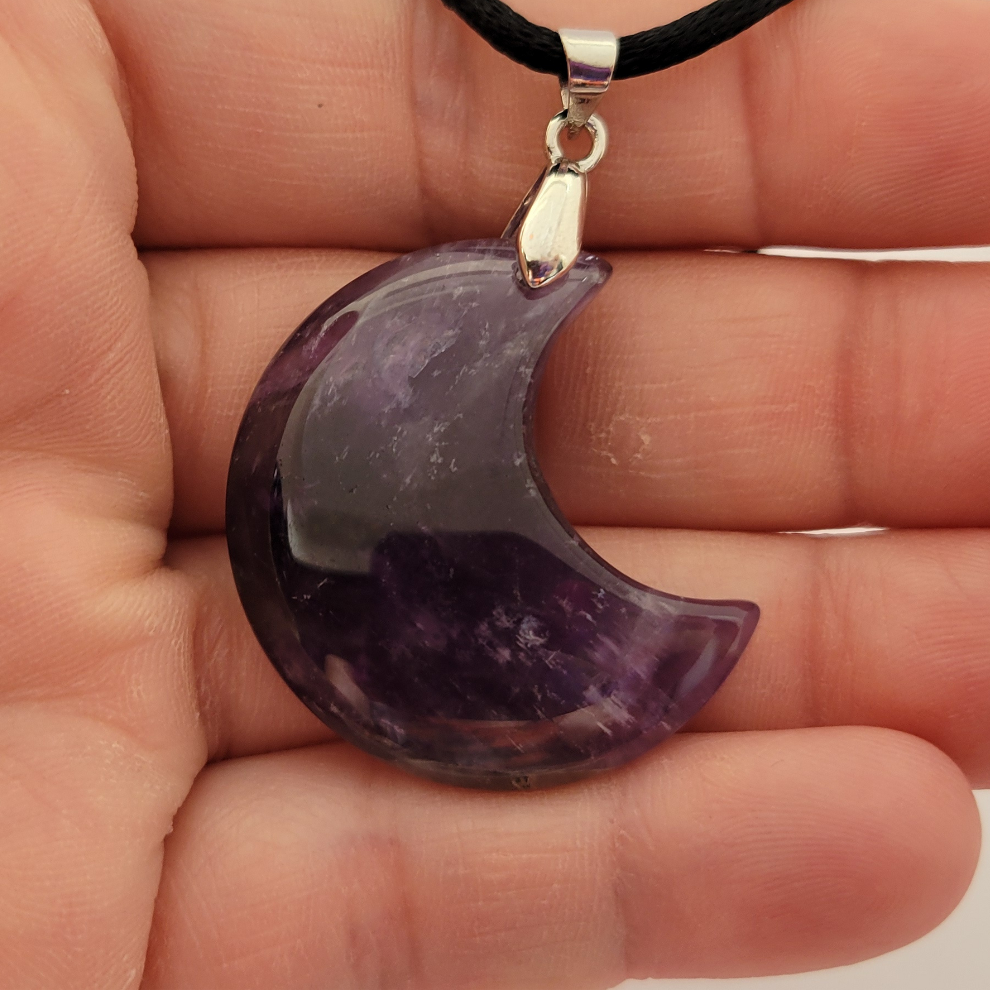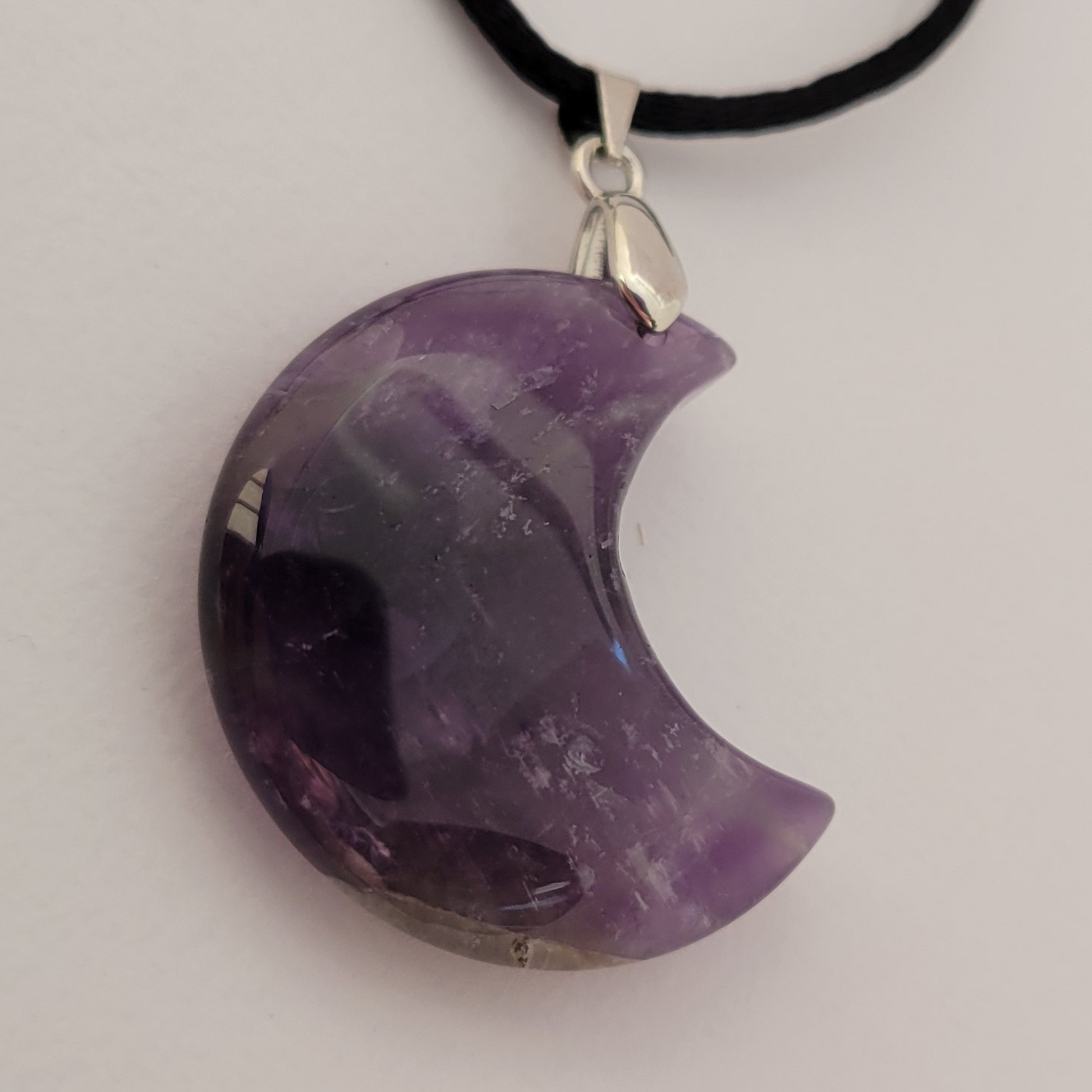 These polished Amethyst crescent moons are strung on a soft black silky cord and shine with rich purple tones. Amethyst is a powerful crystal for protection, emotional balance, and spiritual connection. The crescent shape symbolizes intuition, feminine energy, and the magic of cycles.