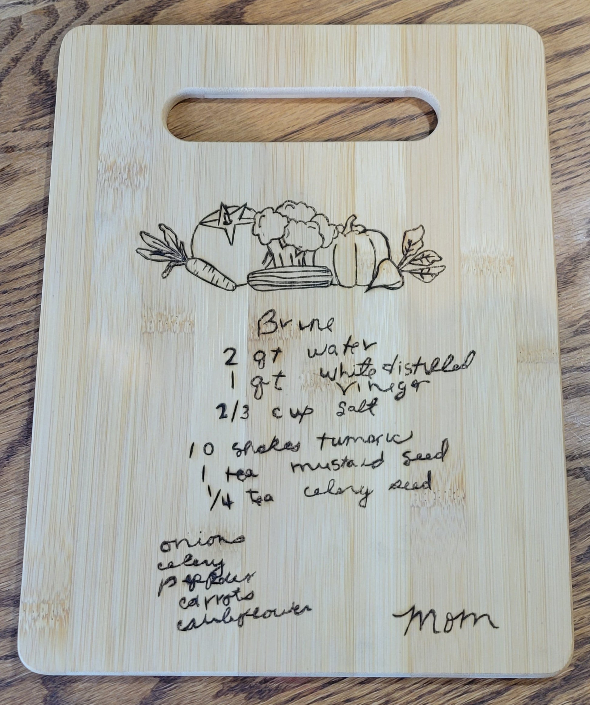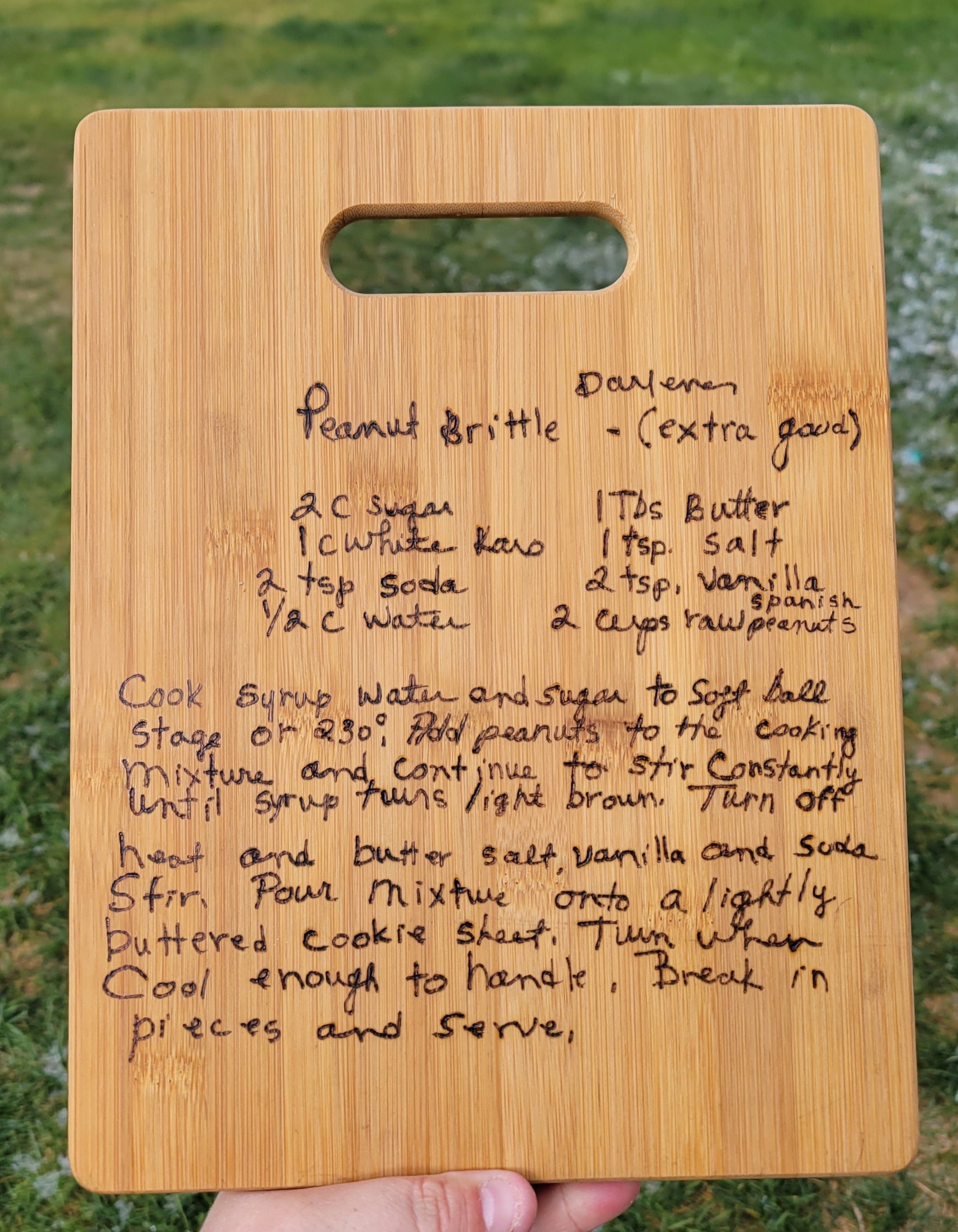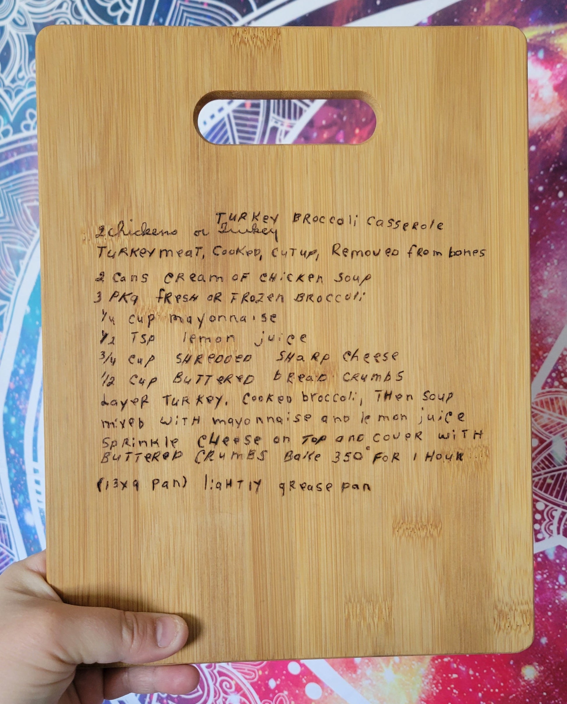 Custom woodburn cutting board, handwritten recipe