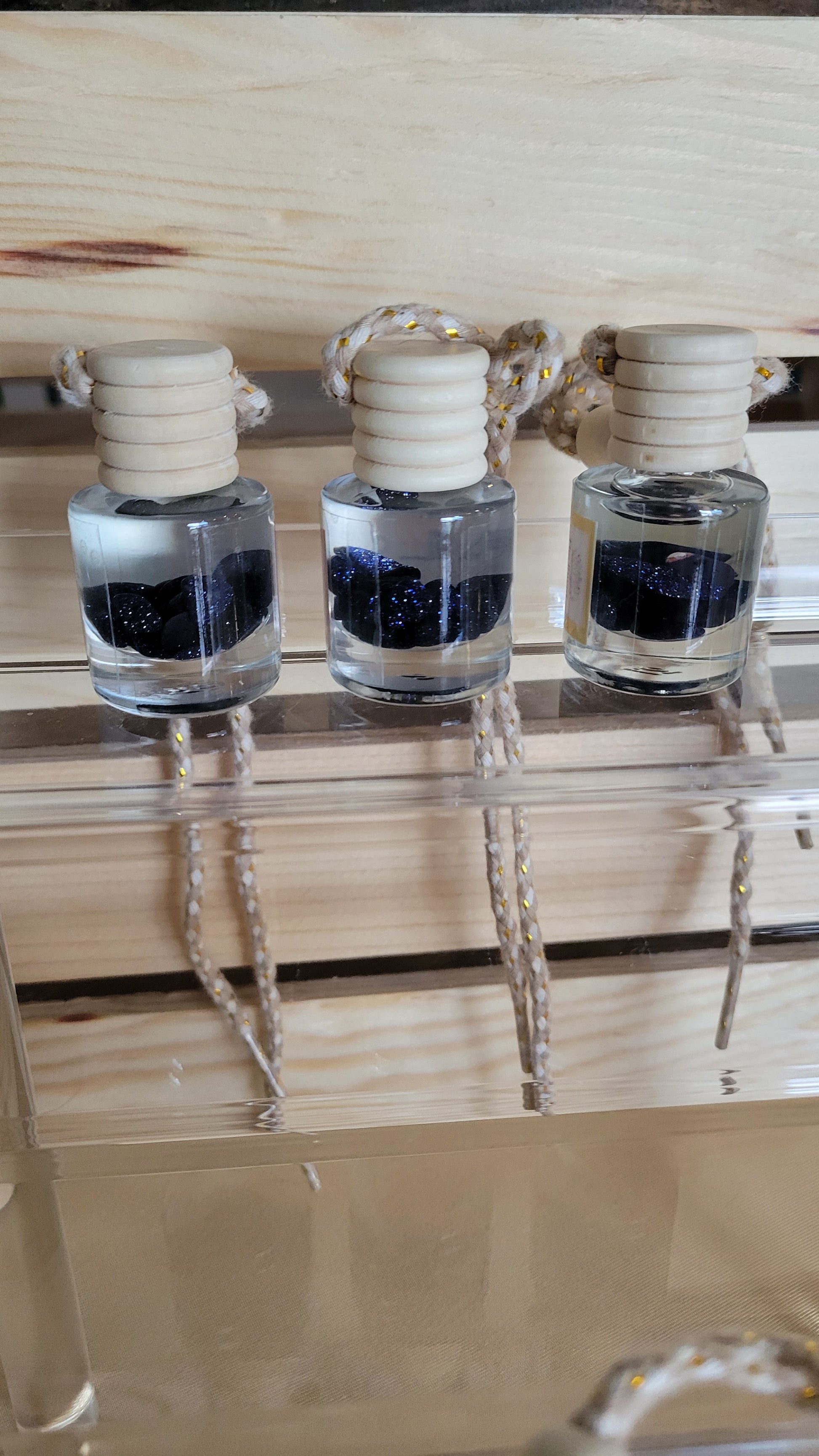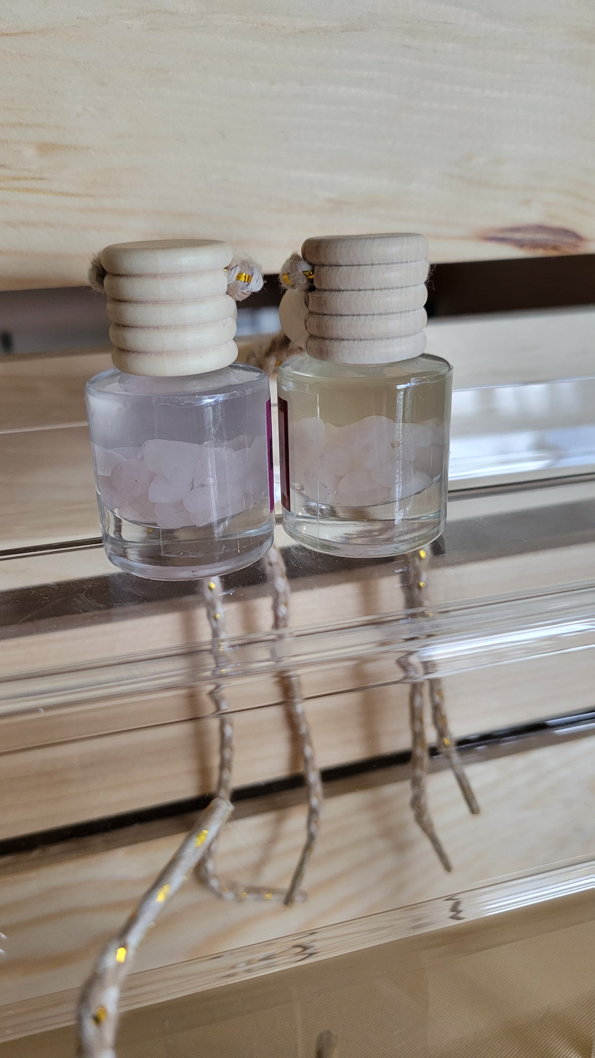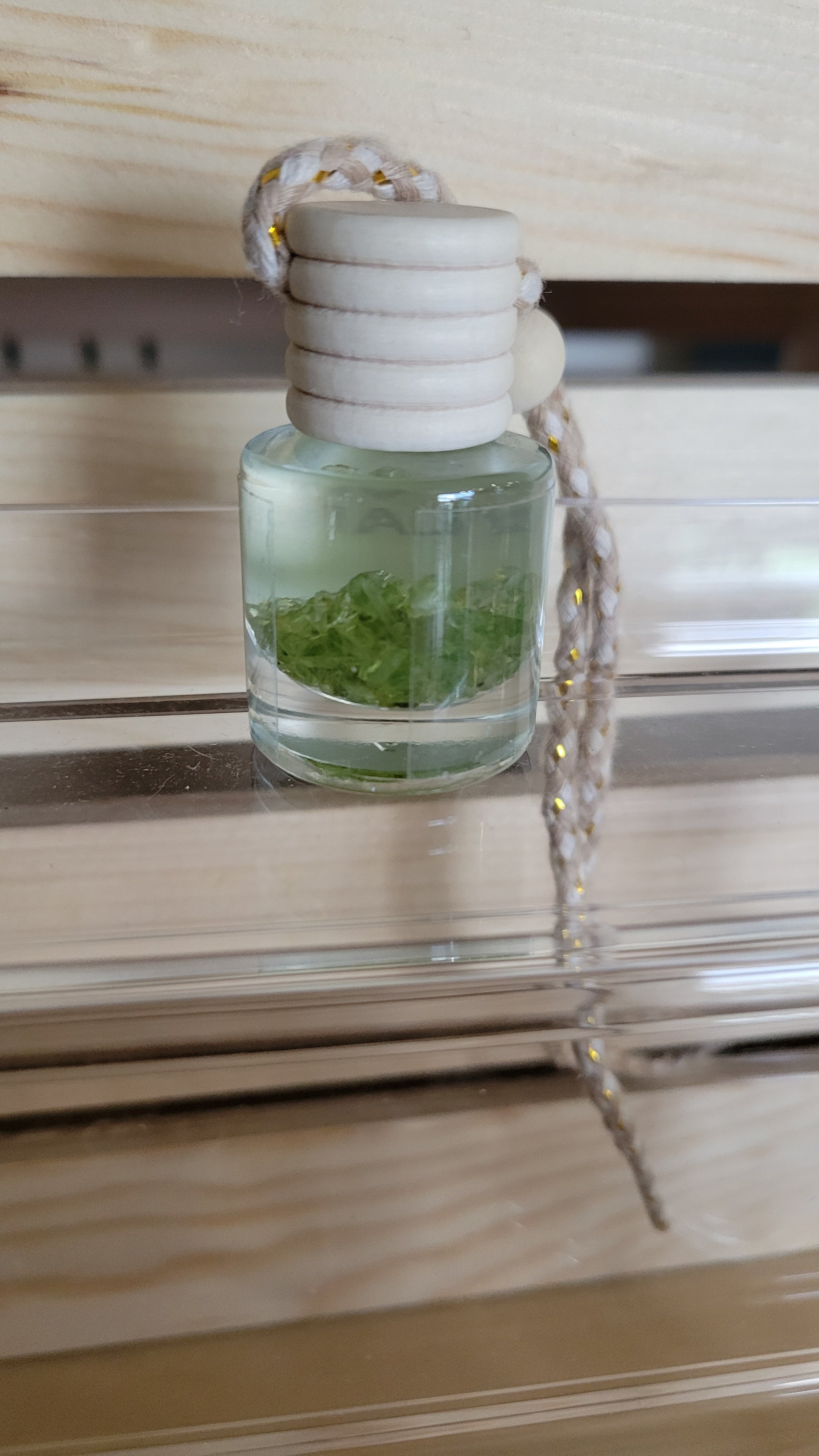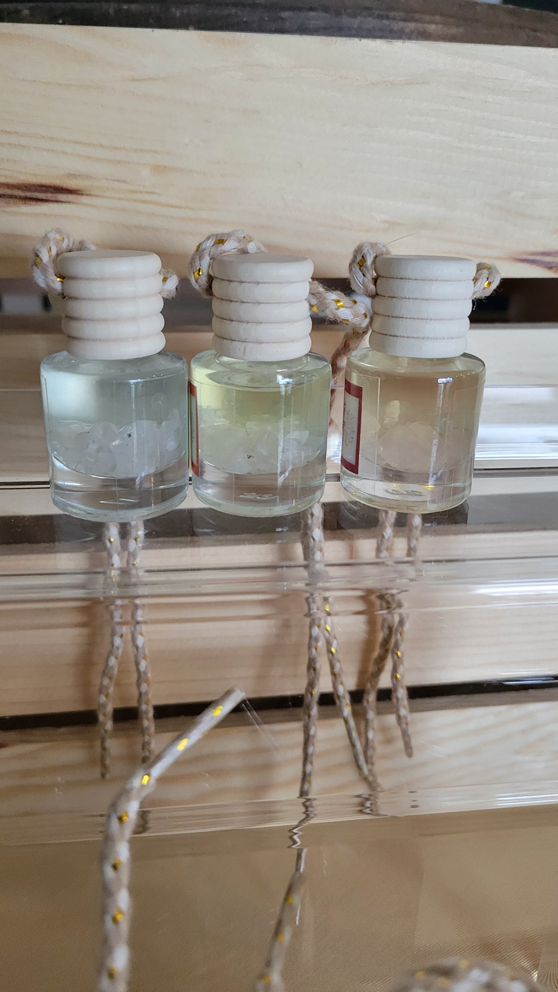Natural car freshener. I use fractionated coconut oil and essential oil for the fragrance. I also add crystal chips for added protection.