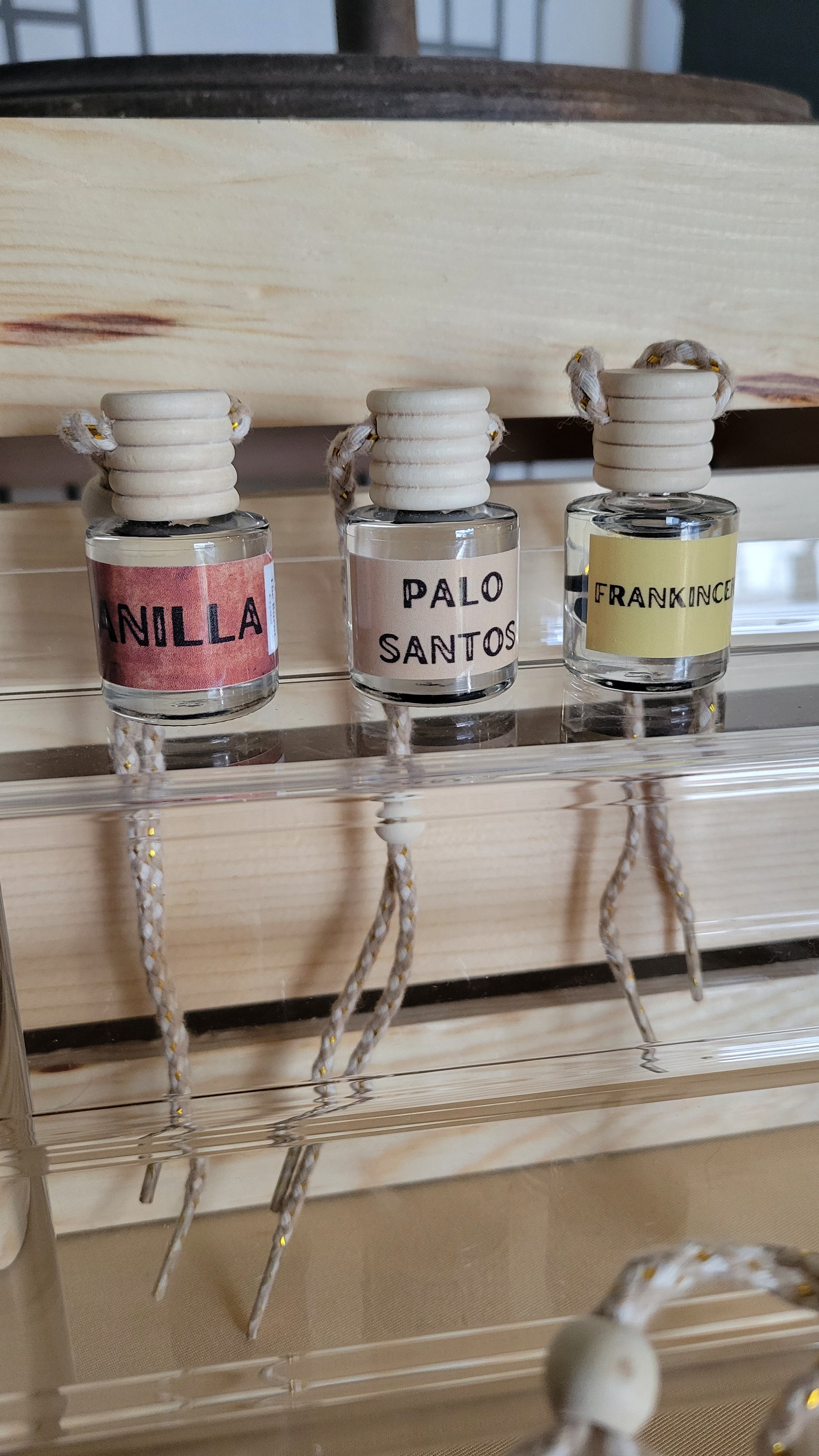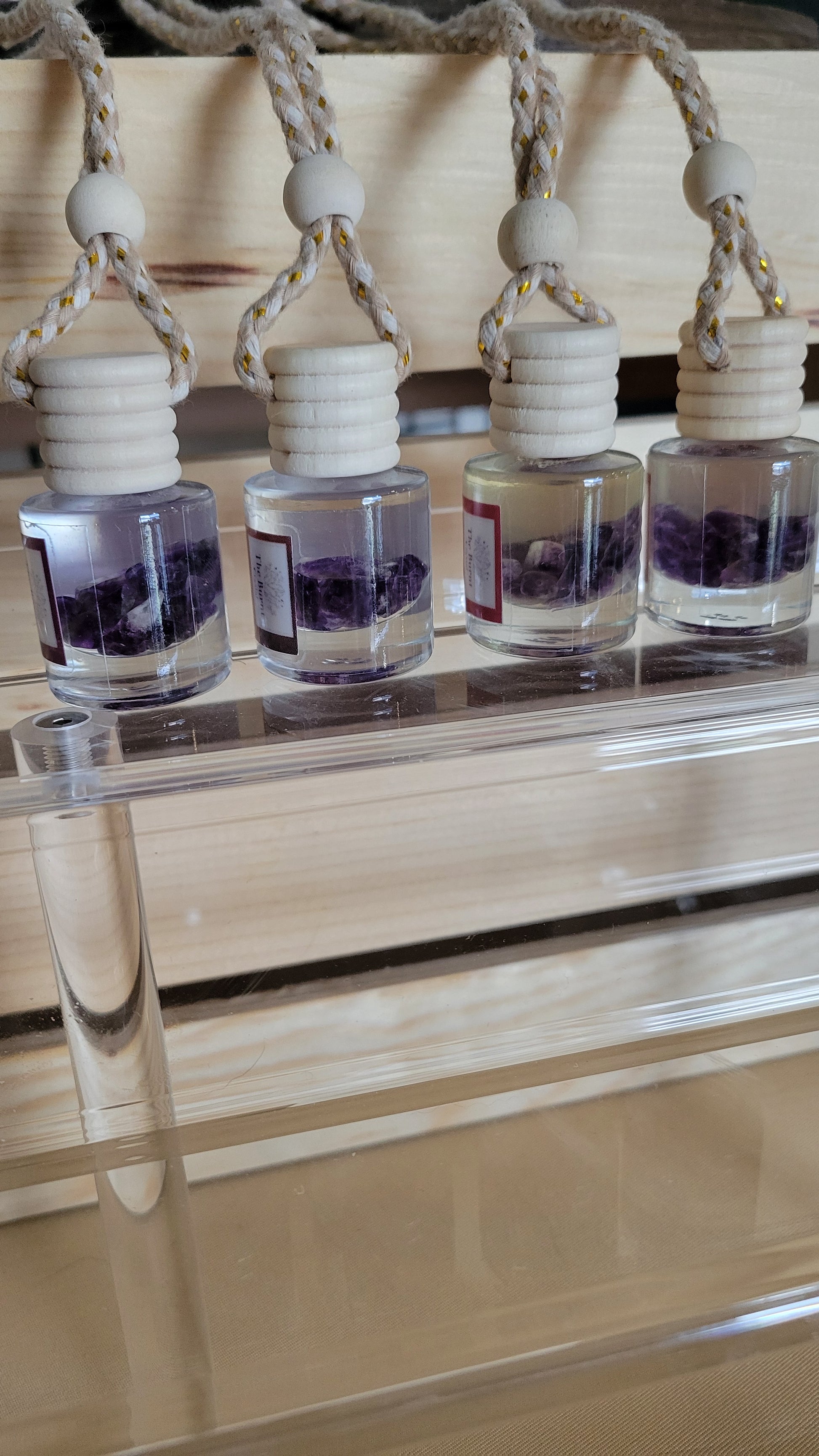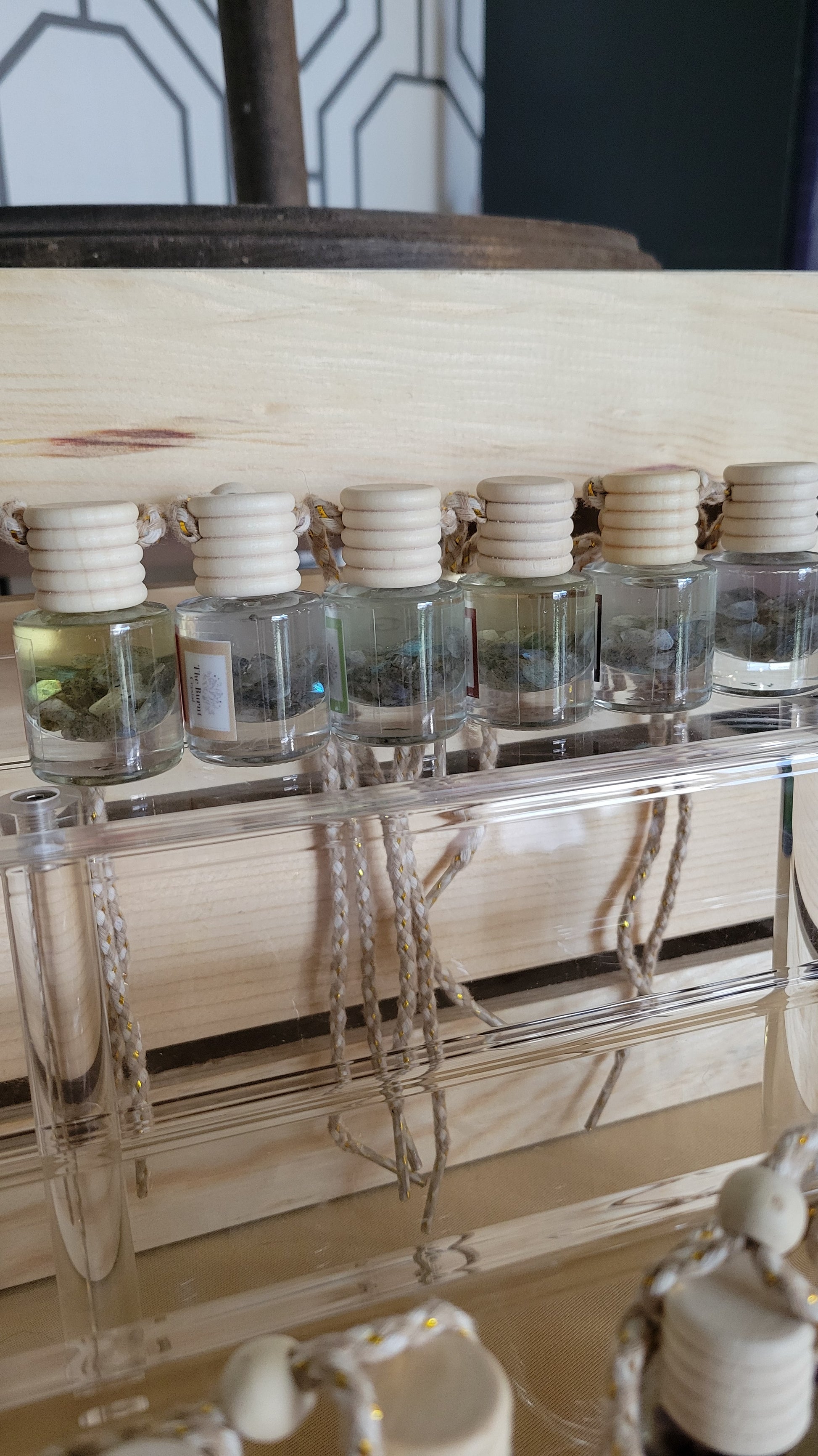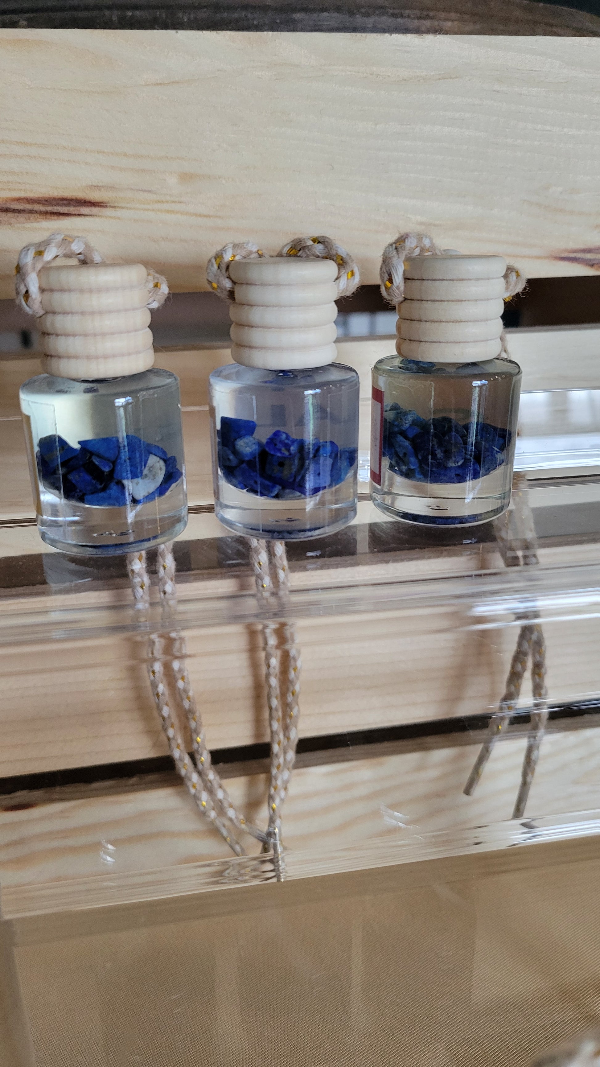 Natural car freshener. I use fractionated coconut oil and essential oil for the fragrance. I also add crystal chips for added protection.