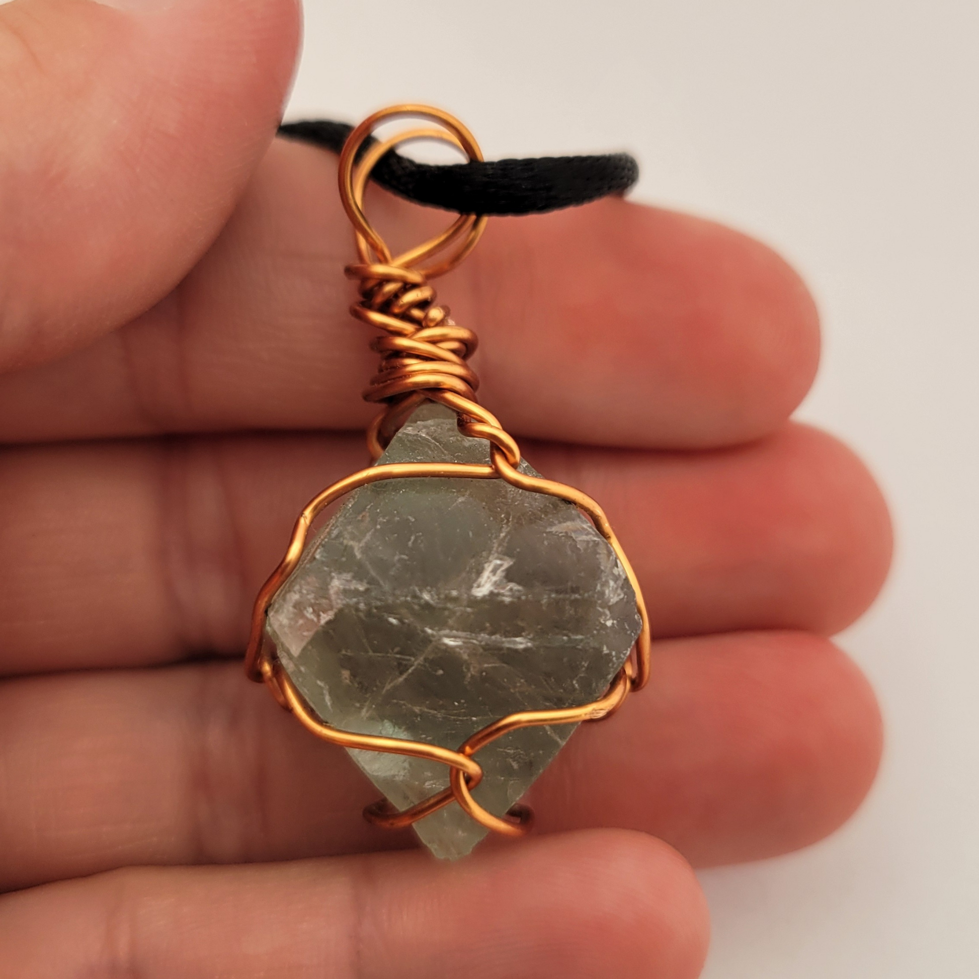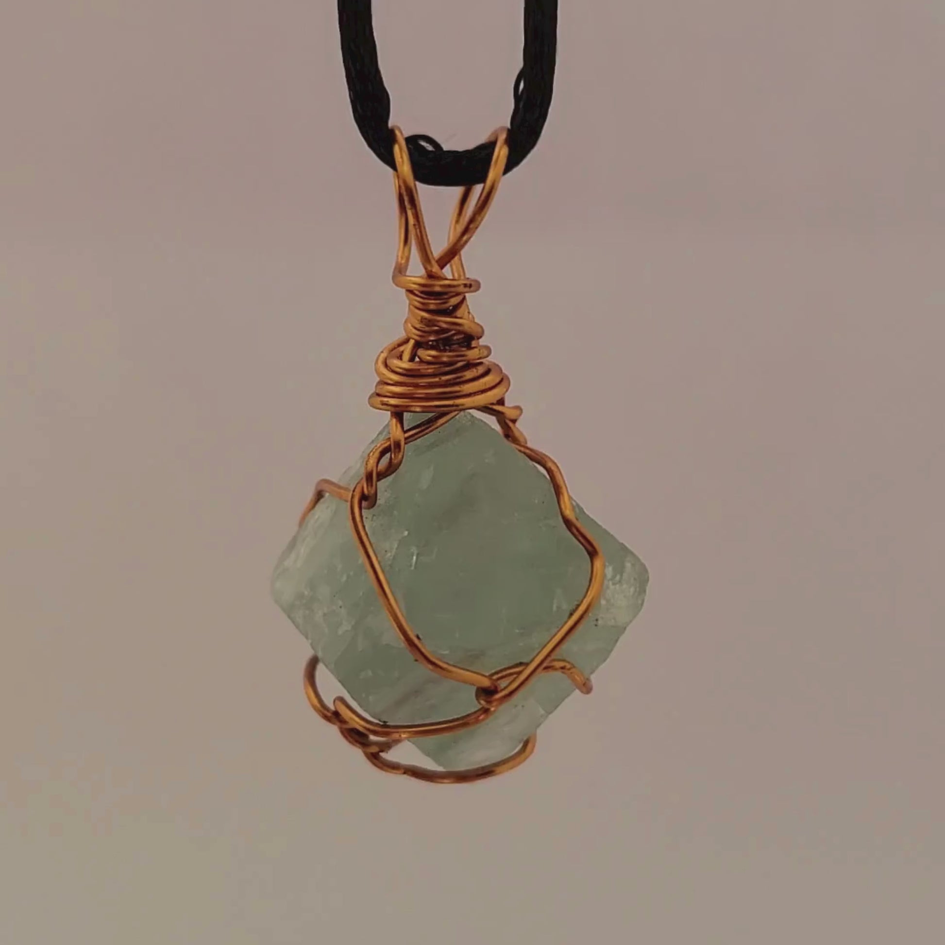 This raw green Fluorite cube is full of natural texture and soft, serene energy. Wrapped in non-tarnishing copper wire and strung on a black silky cord, this pendant brings grounding clarity and focus to your day. The cube shape enhances stability and structure in both thought and energy.