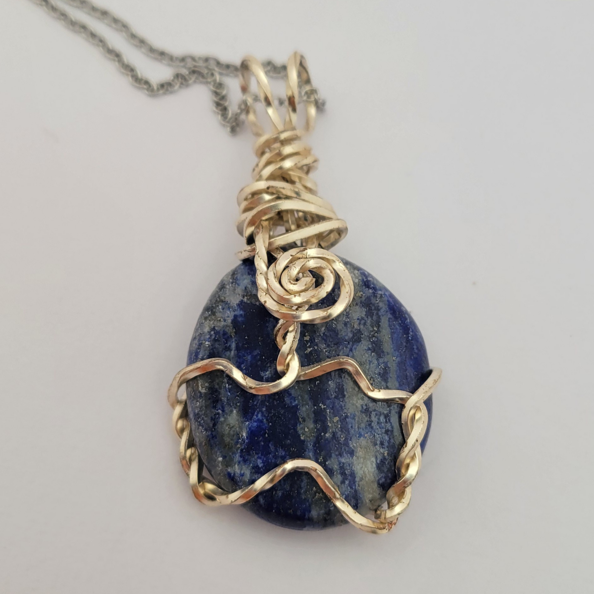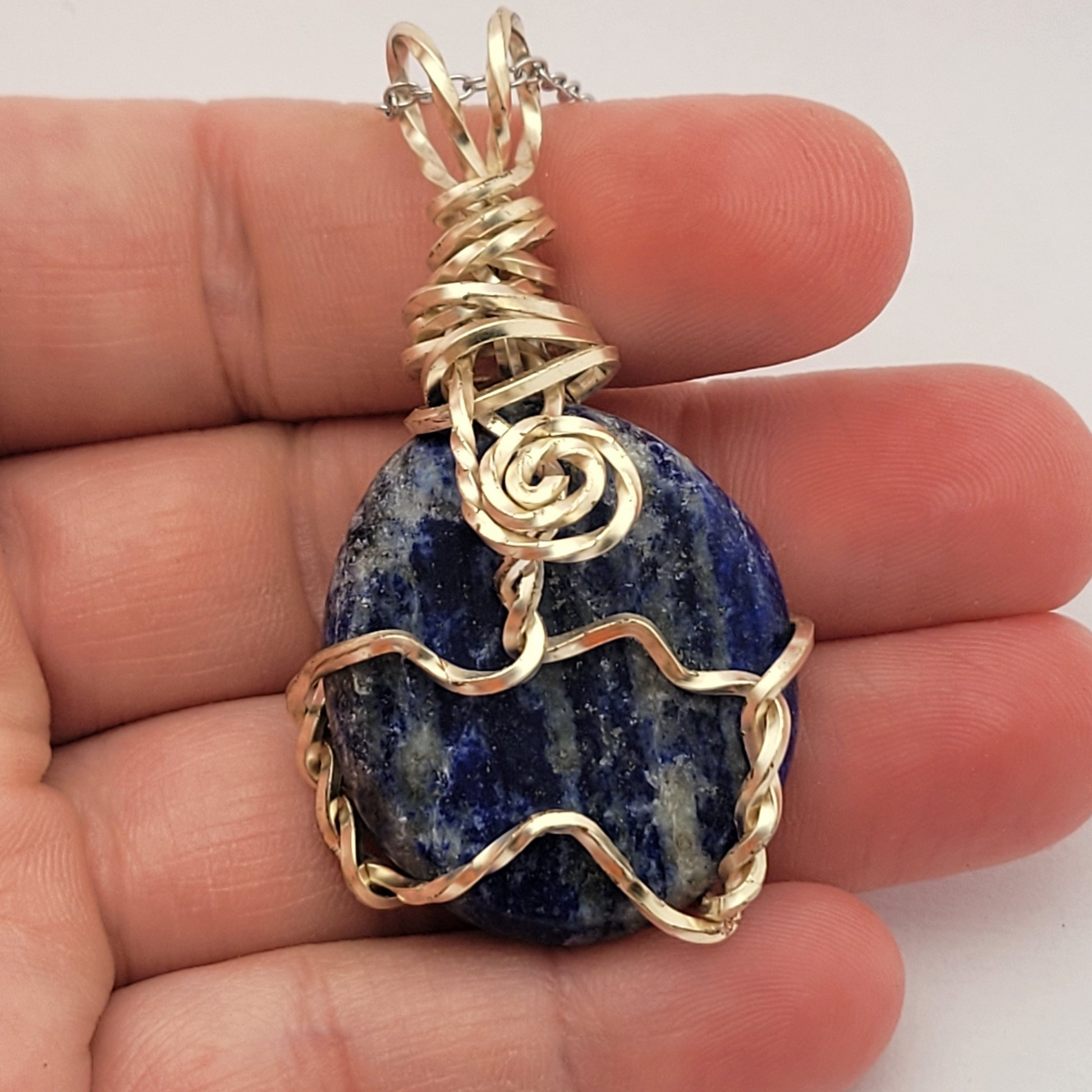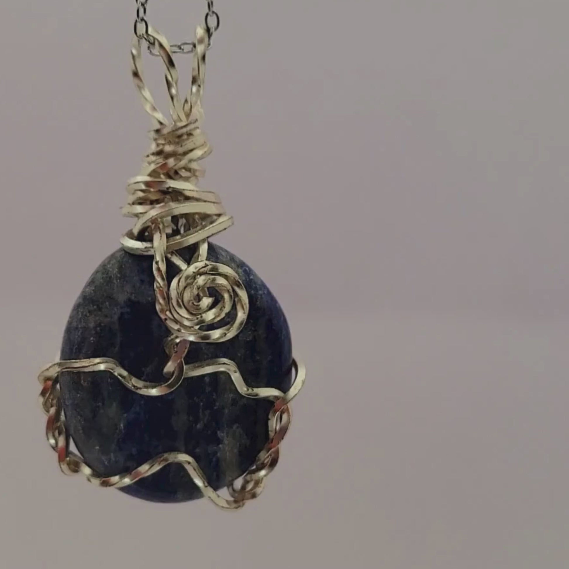This deep blue Lapis Lazuli coin is wrapped in striking non-tarnishing square silver wire, giving it a modern, structured edge with an artistic spiral accent. Known as the stone of truth and wisdom, this pendant is perfect for clear communication and intuitive insight. Comes on a sleek silver-toned chain, ready to wear.