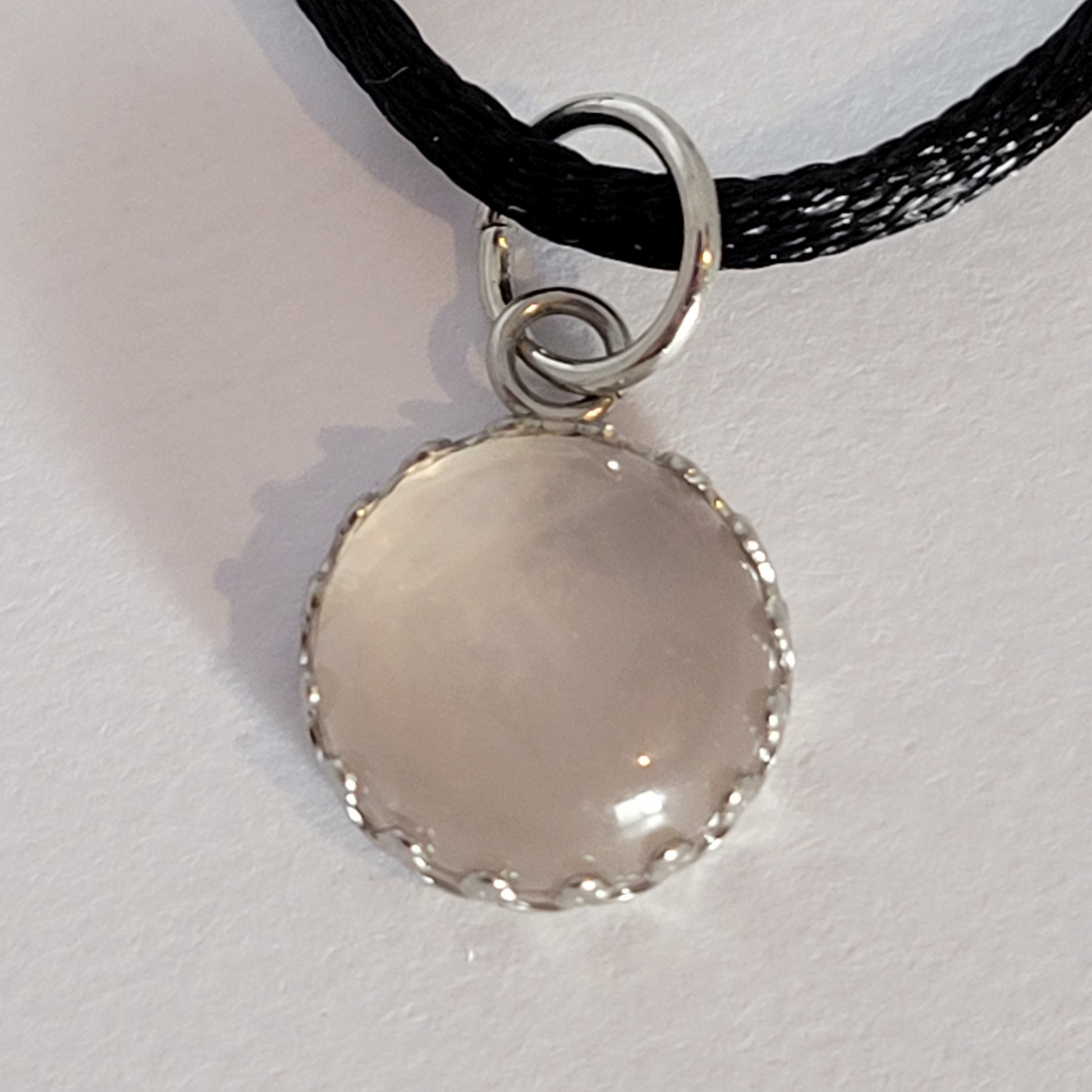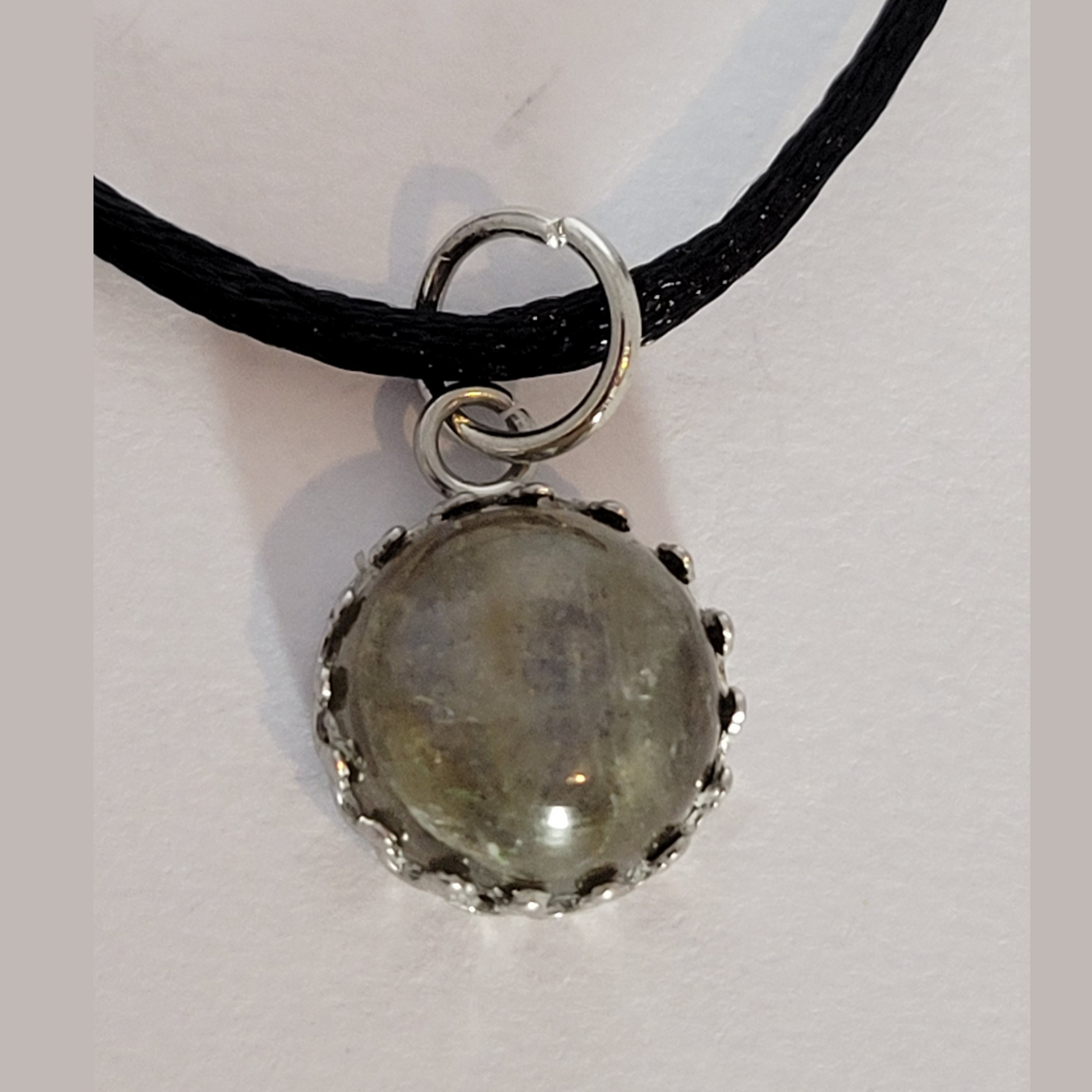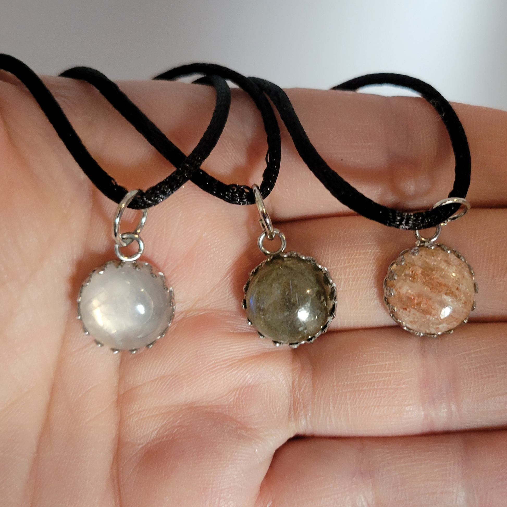 These dainty round cabochons are set in a silver-tone crown bezel and hung on a black silky cord for everyday magic. Choose your energy: