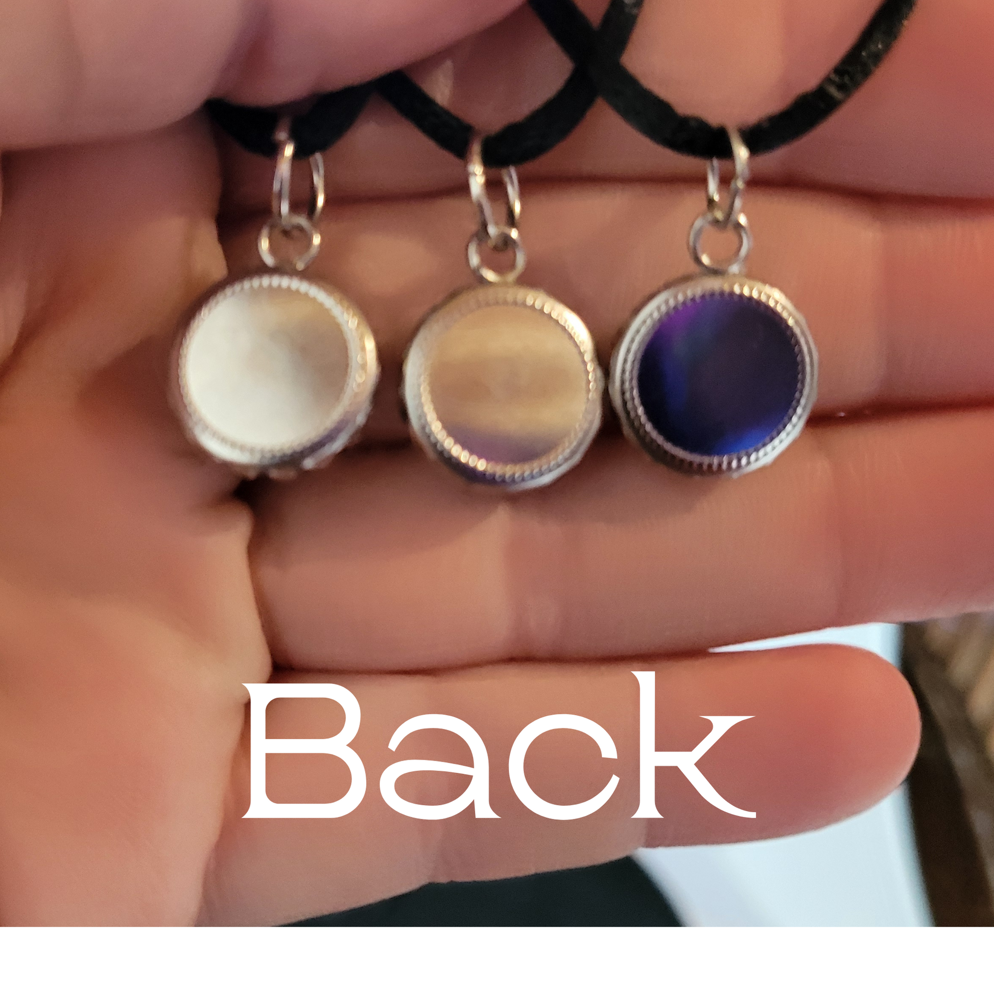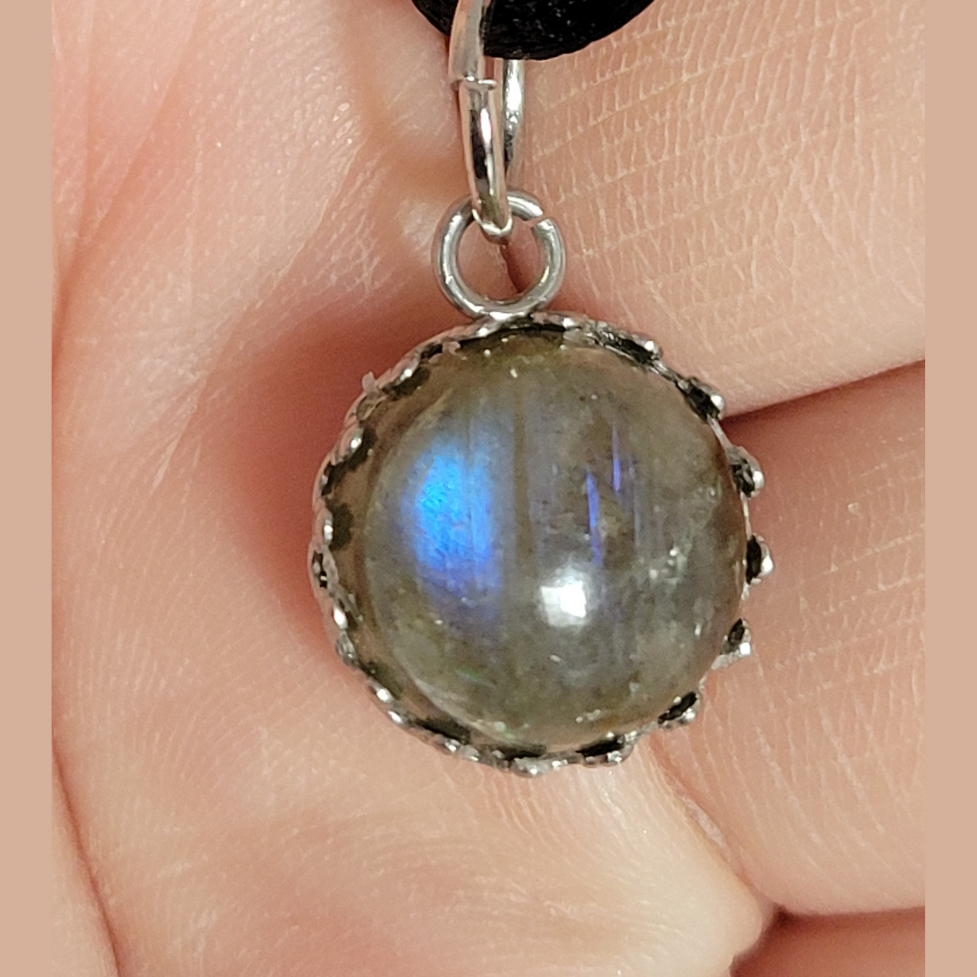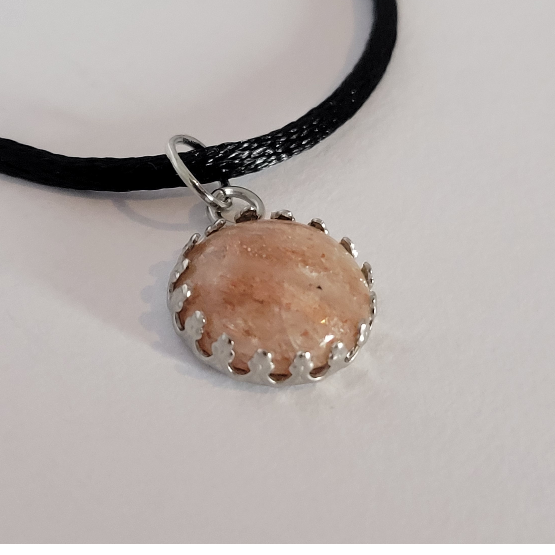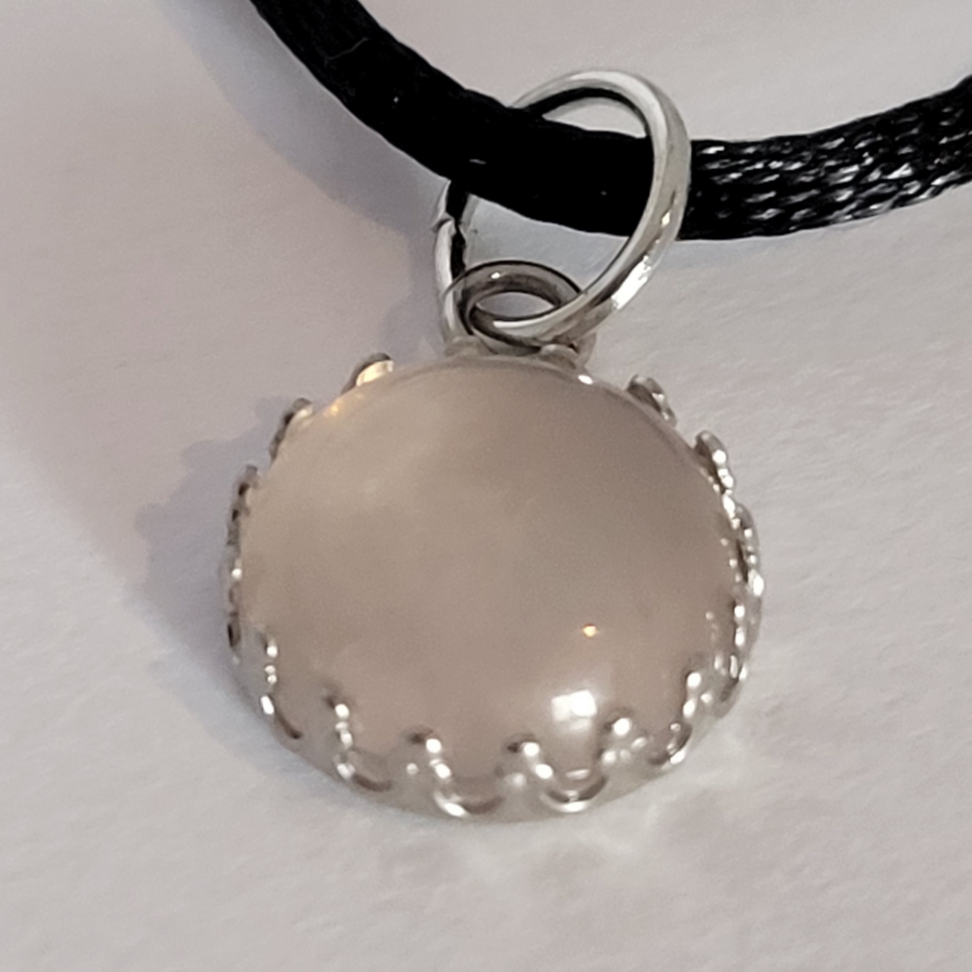 These dainty round cabochons are set in a silver-tone crown bezel and hung on a black silky cord for everyday magic. Choose your energy: