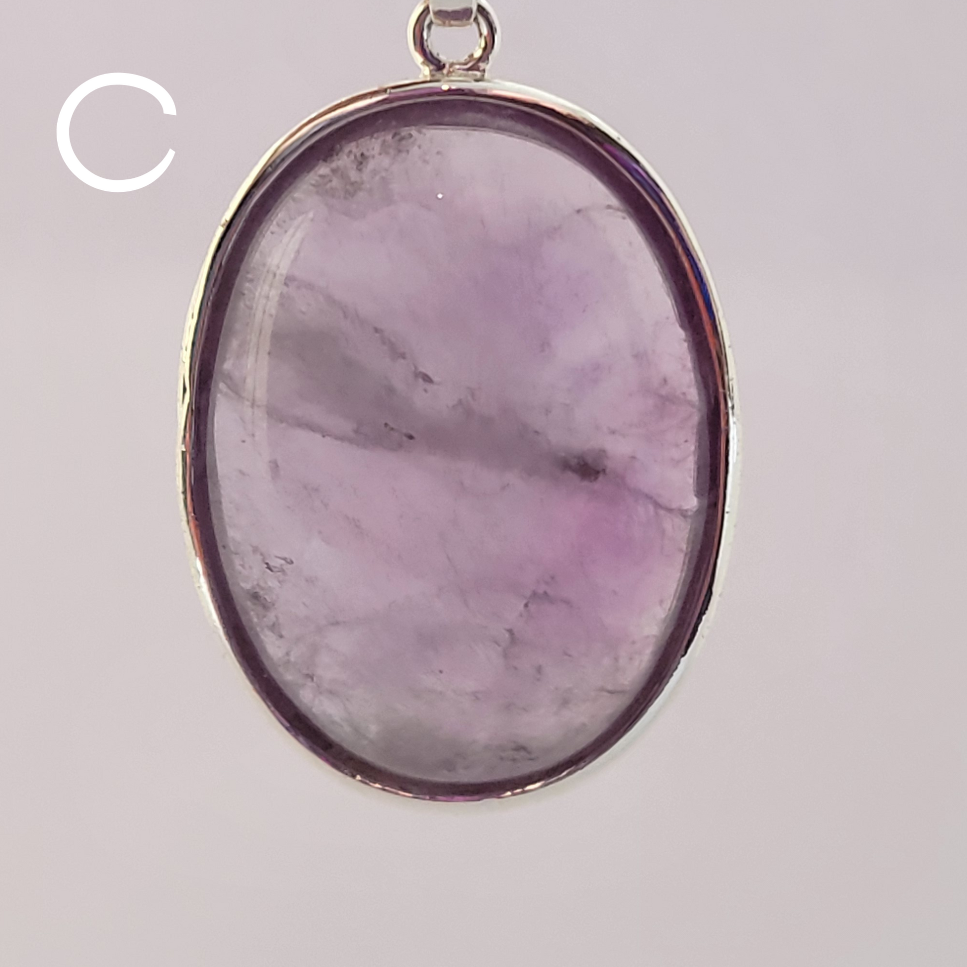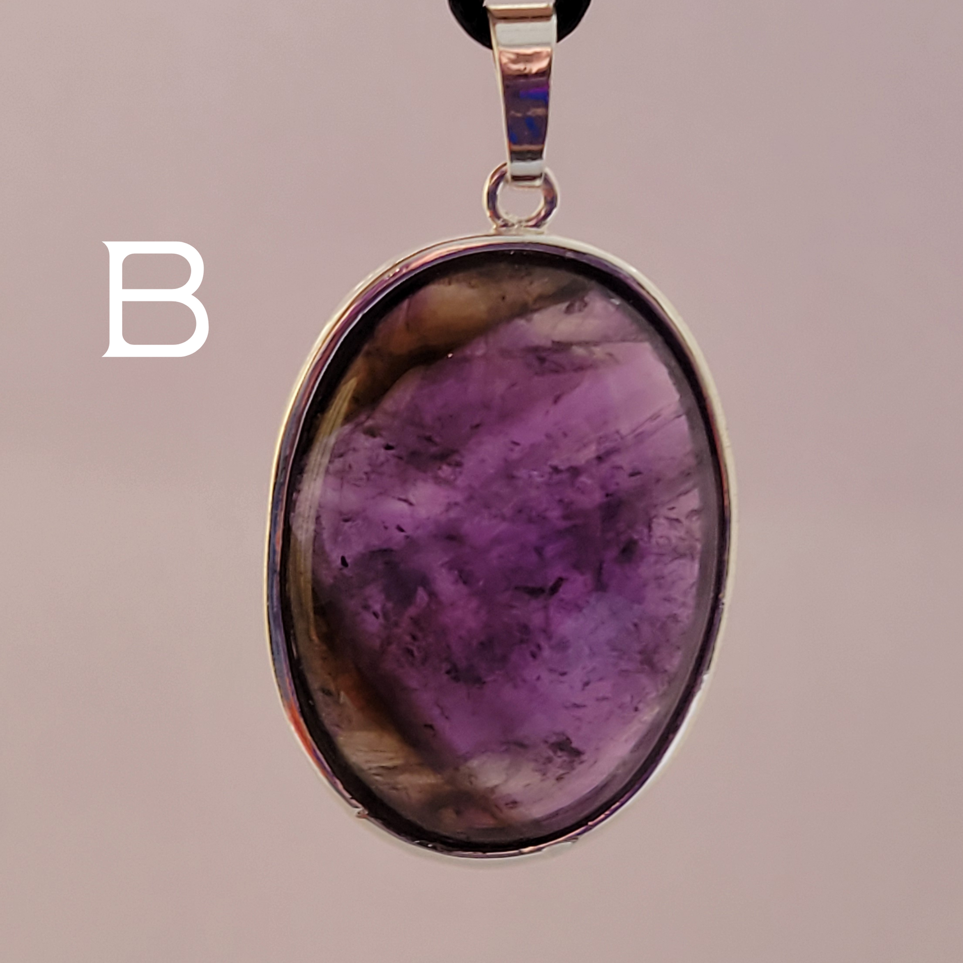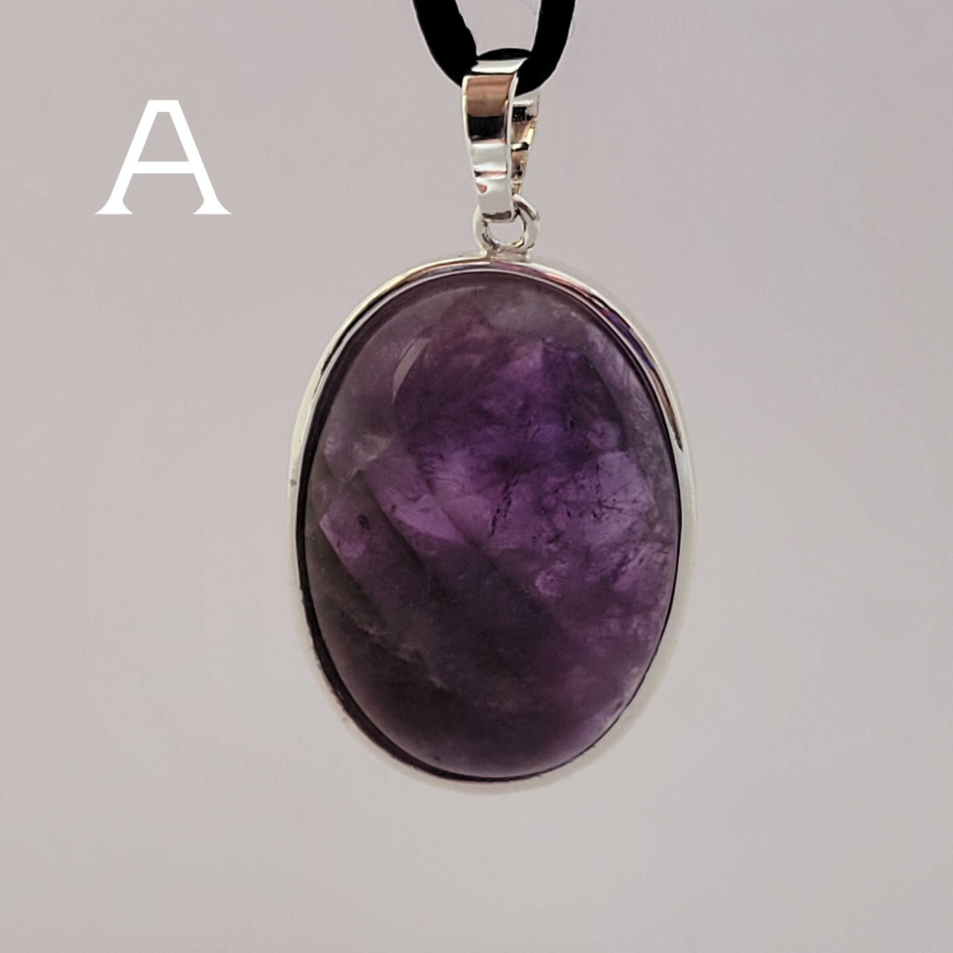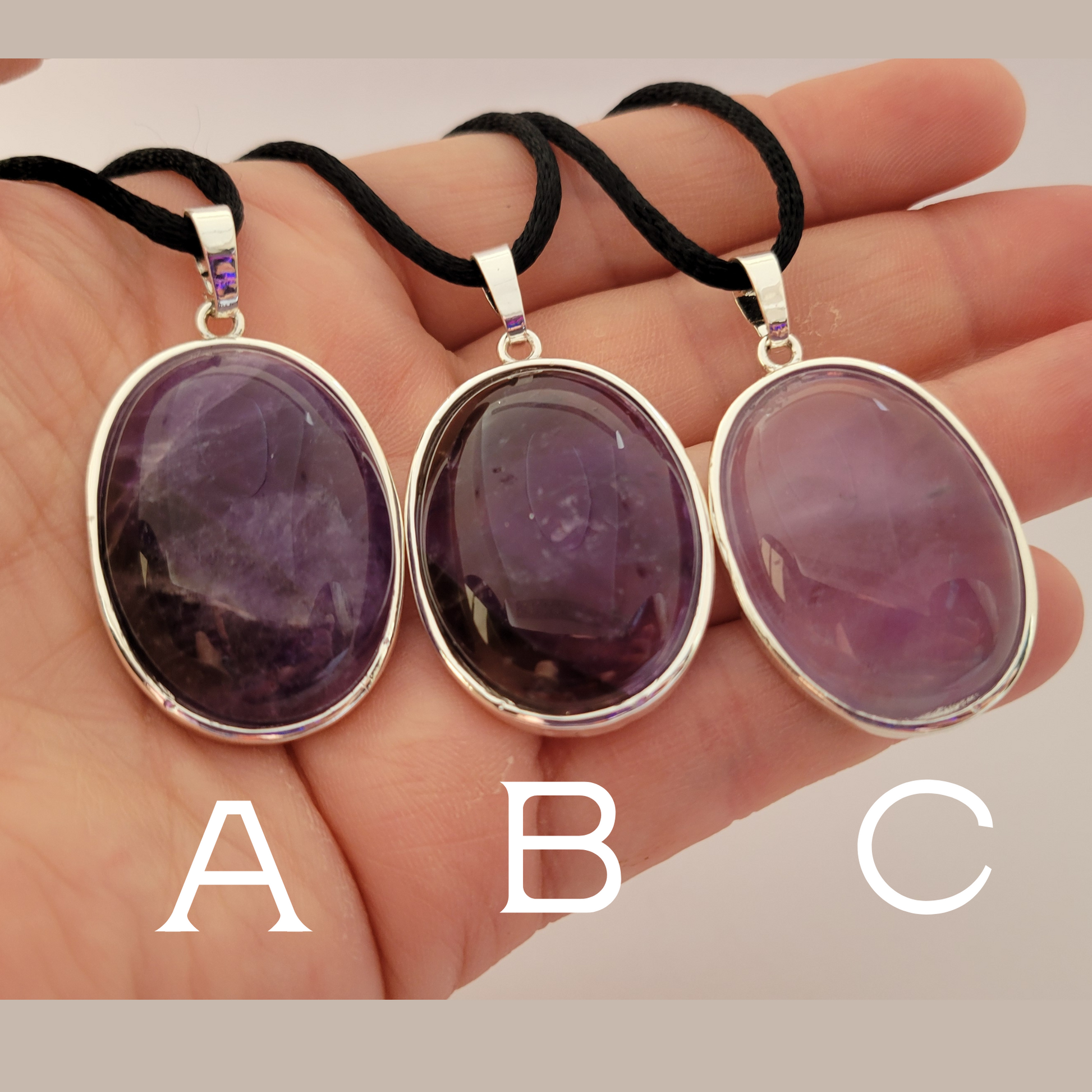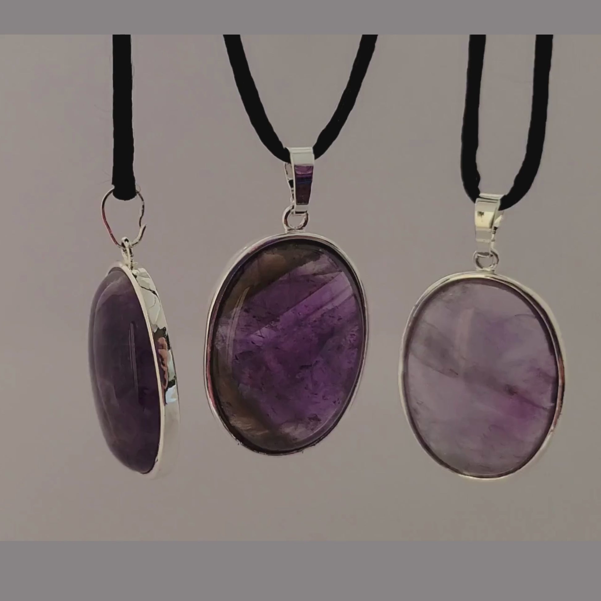 These polished Amethyst cabochons are set in a sleek silver-tone bezel and hung on a black silky cord. Amethyst is known for protection, calming energy, and spiritual clarity. Each one has its own unique pattern and shade of purple.