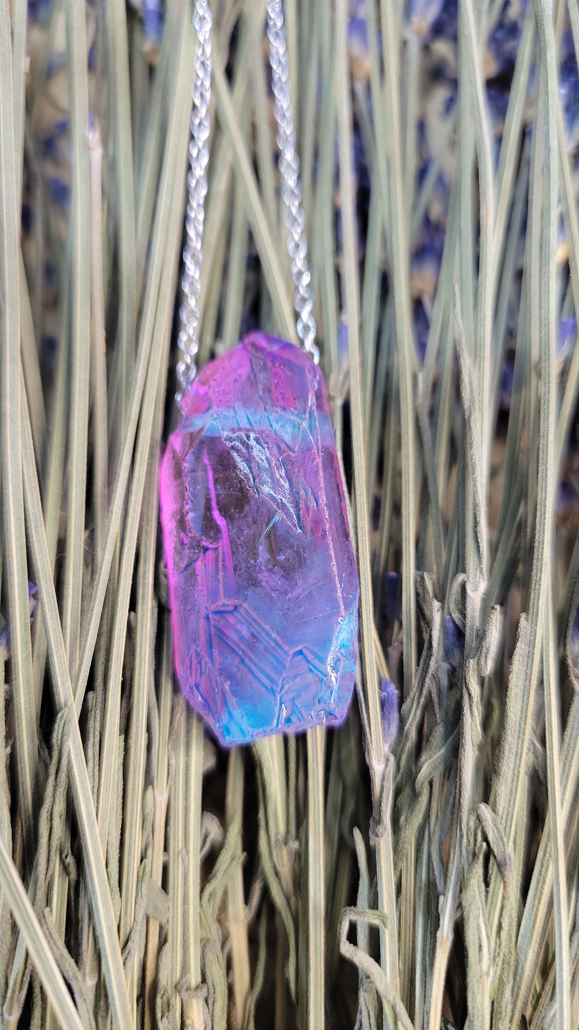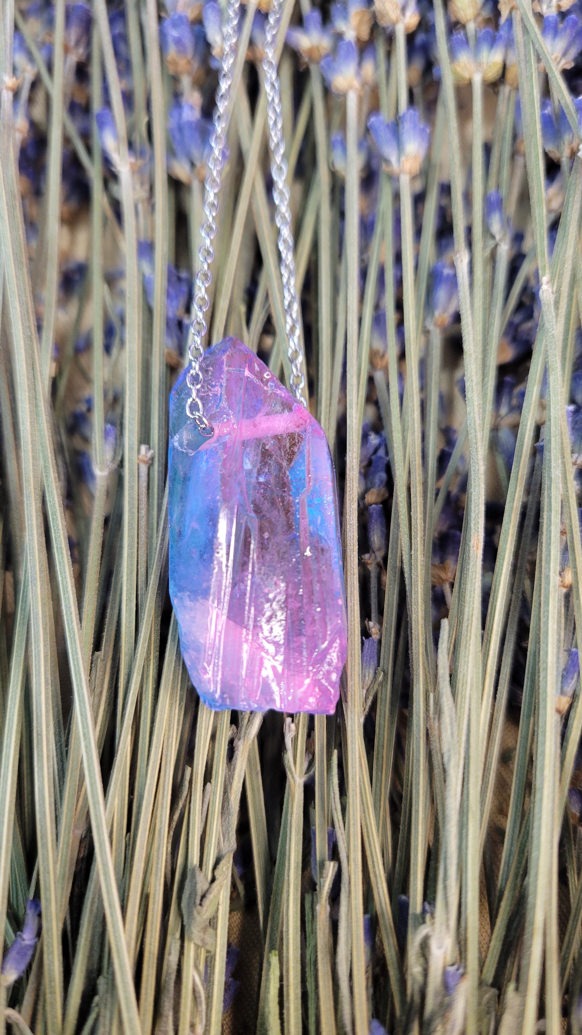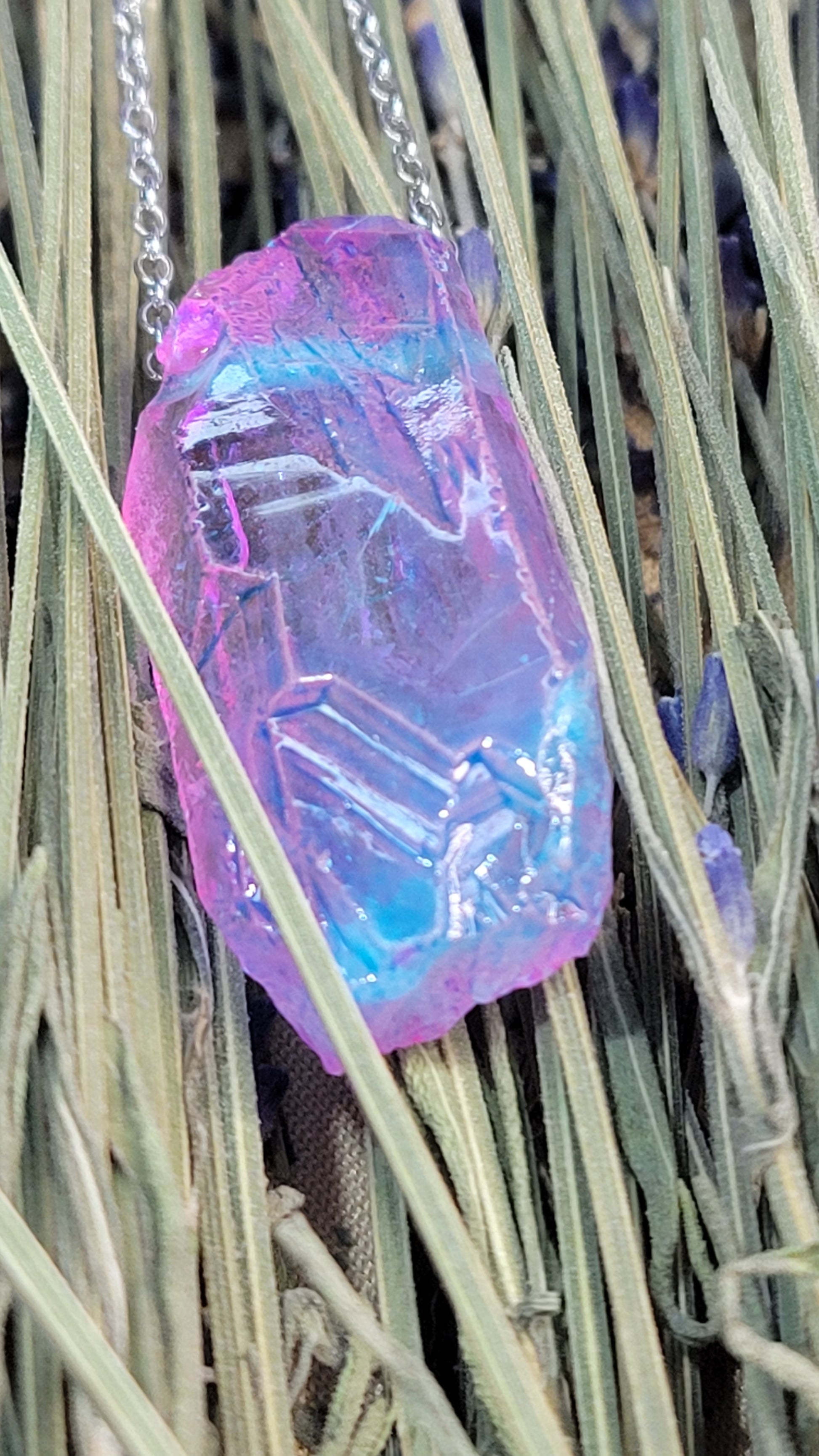 Quartz crystal (artificially colored) crystal strung with simple dainty chain