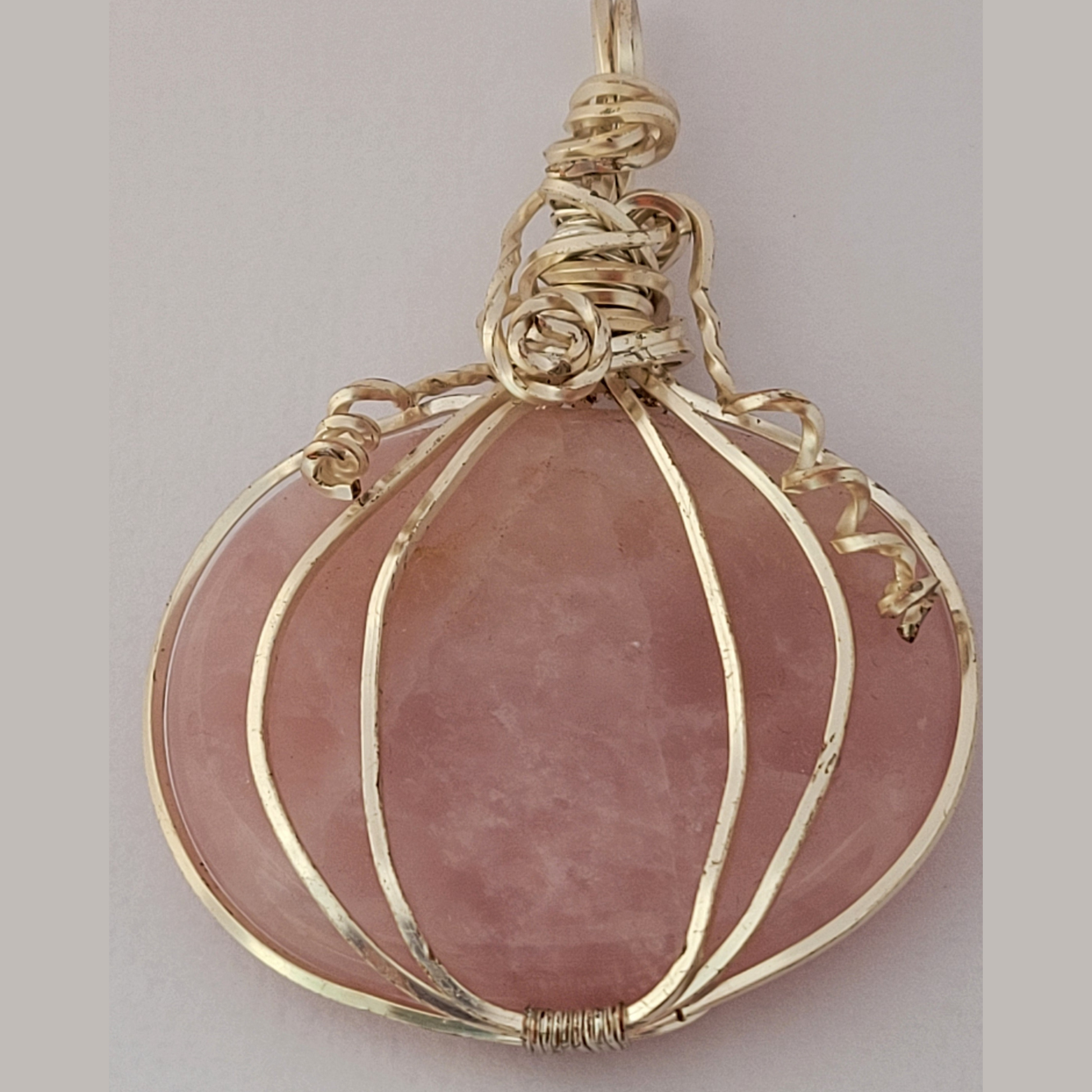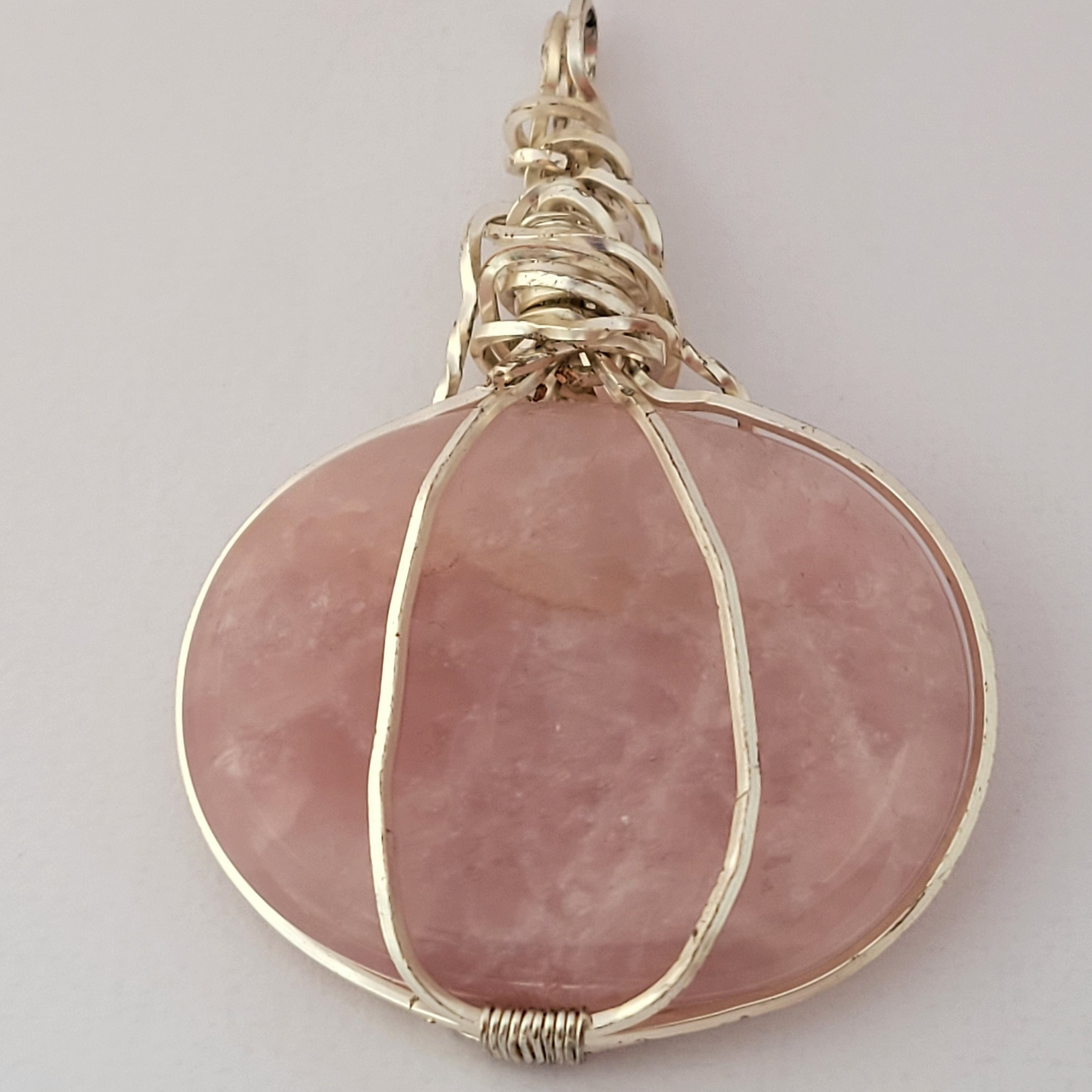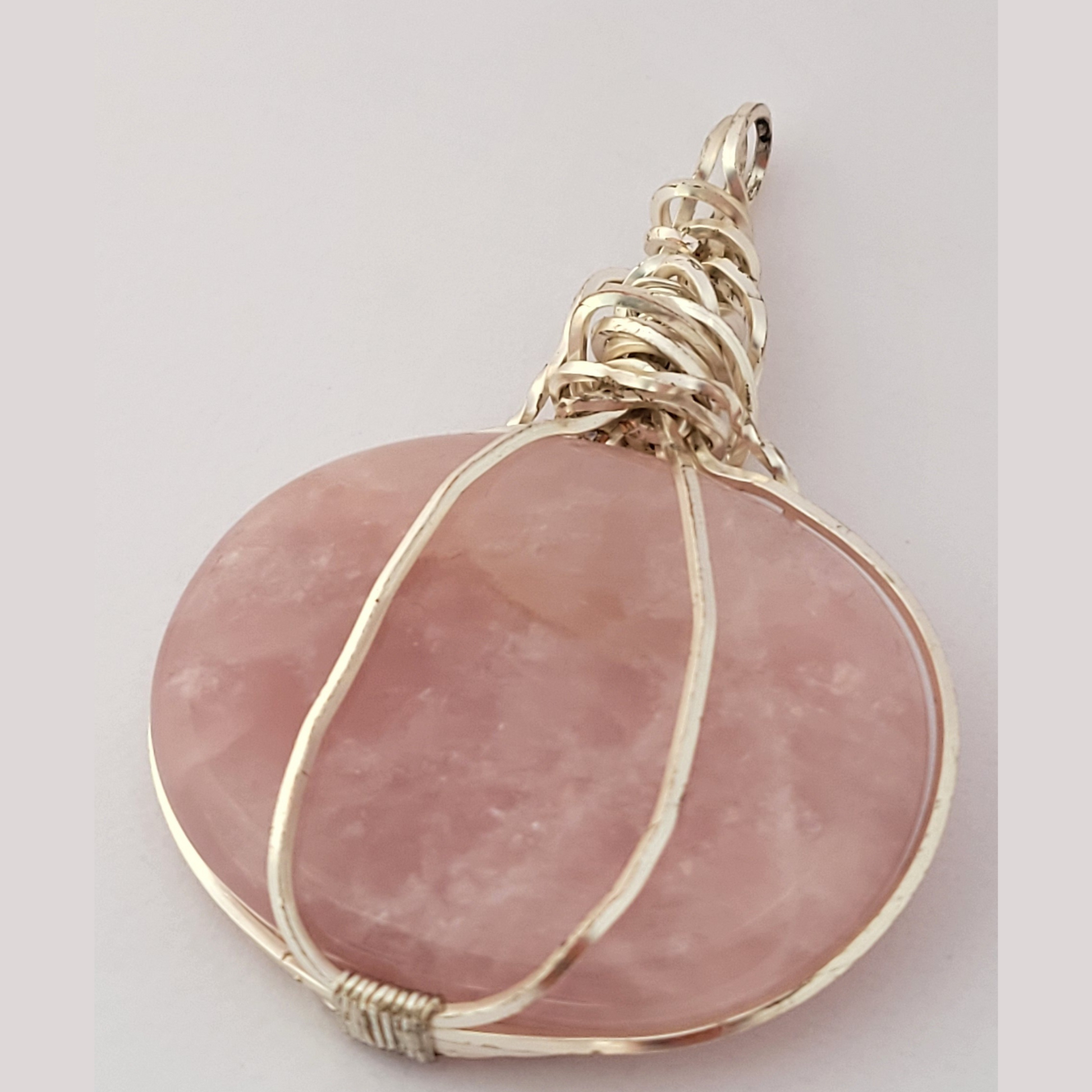 This large, polished Rose Quartz disc is wrapped in structured non-tarnishing square silver wire, with an elegant spiral crown and petal-like cage design. Radiating soft, loving energy, this heart-centered piece is a powerful reminder to lead with compassion—toward yourself and others. A stunning pendant for self-love and emotional healing.