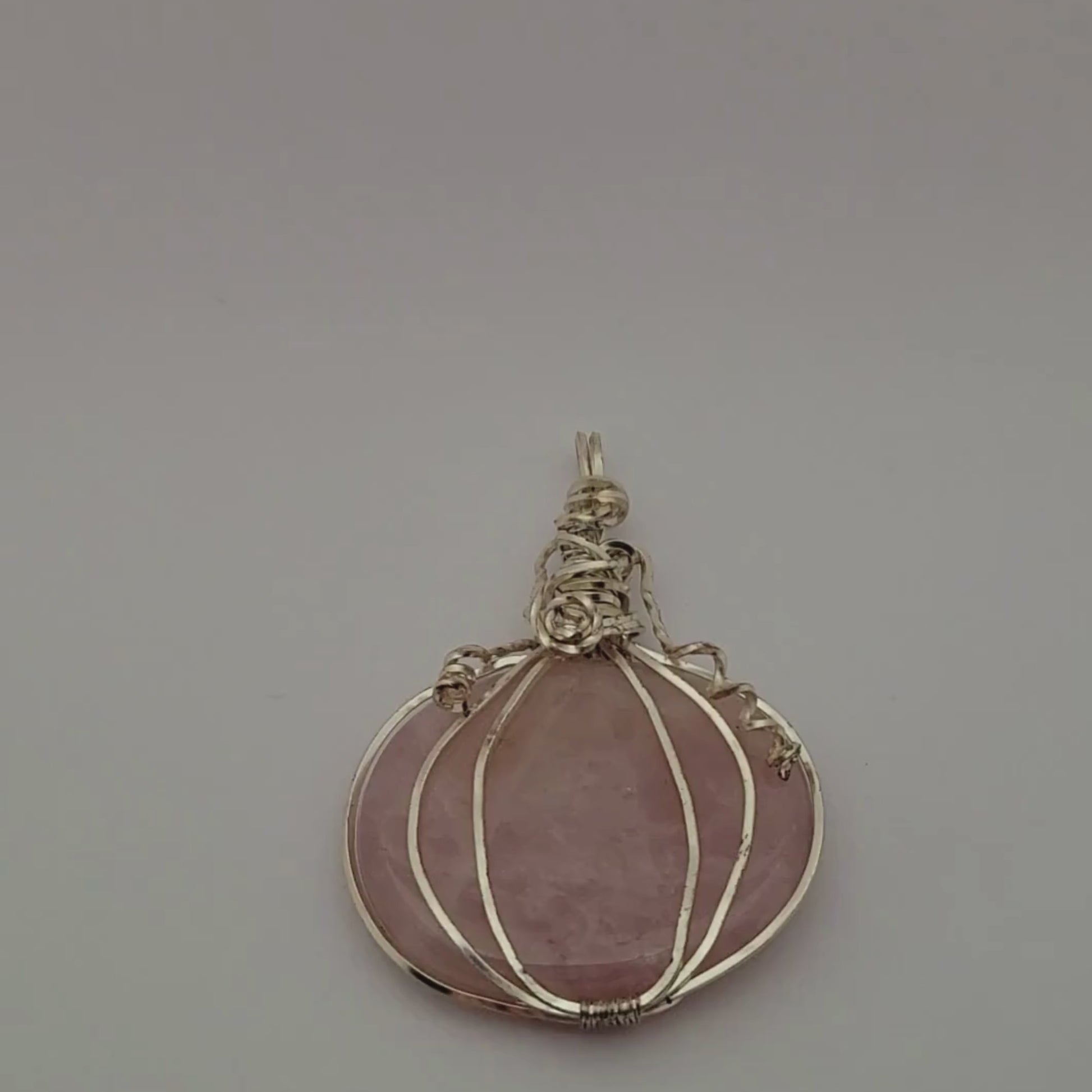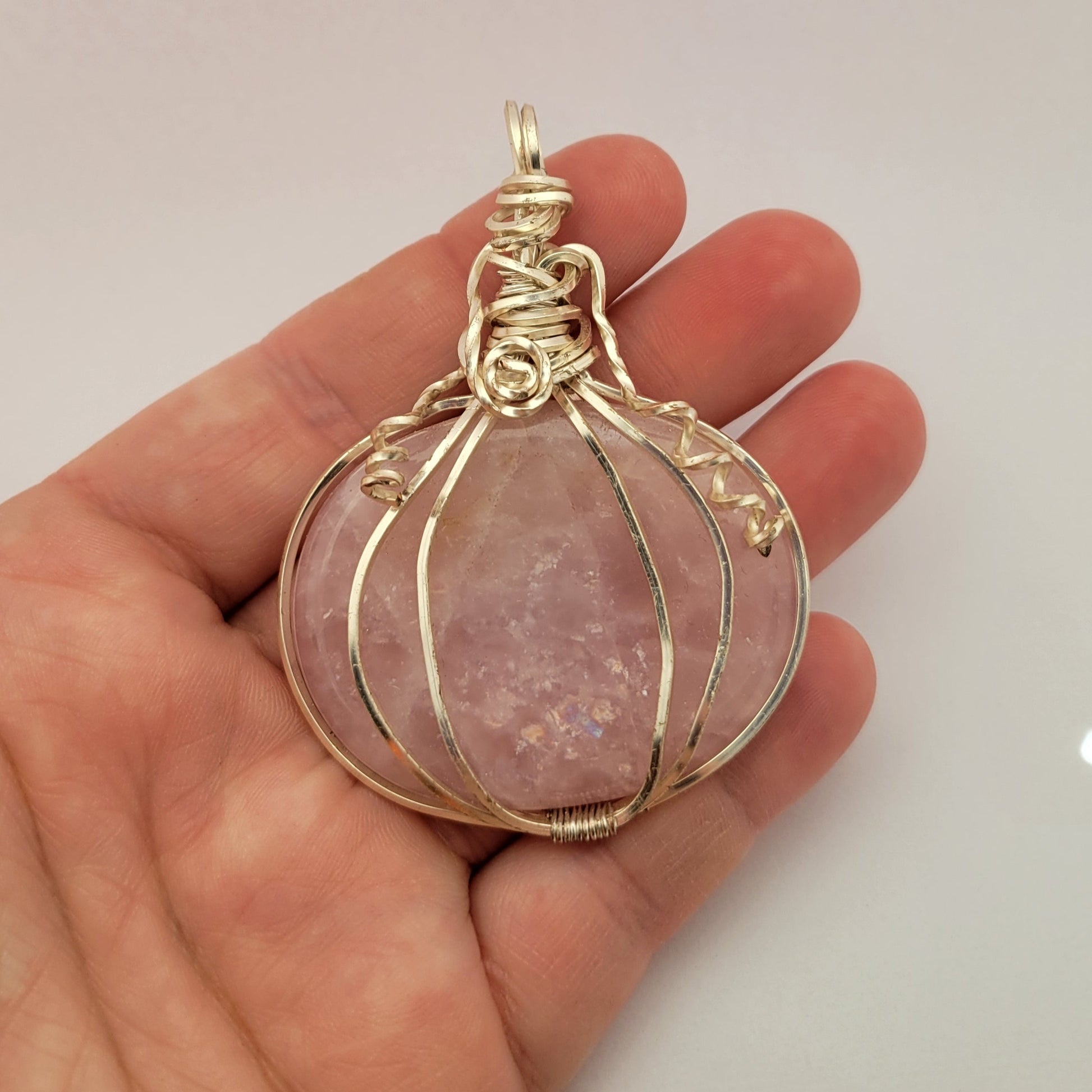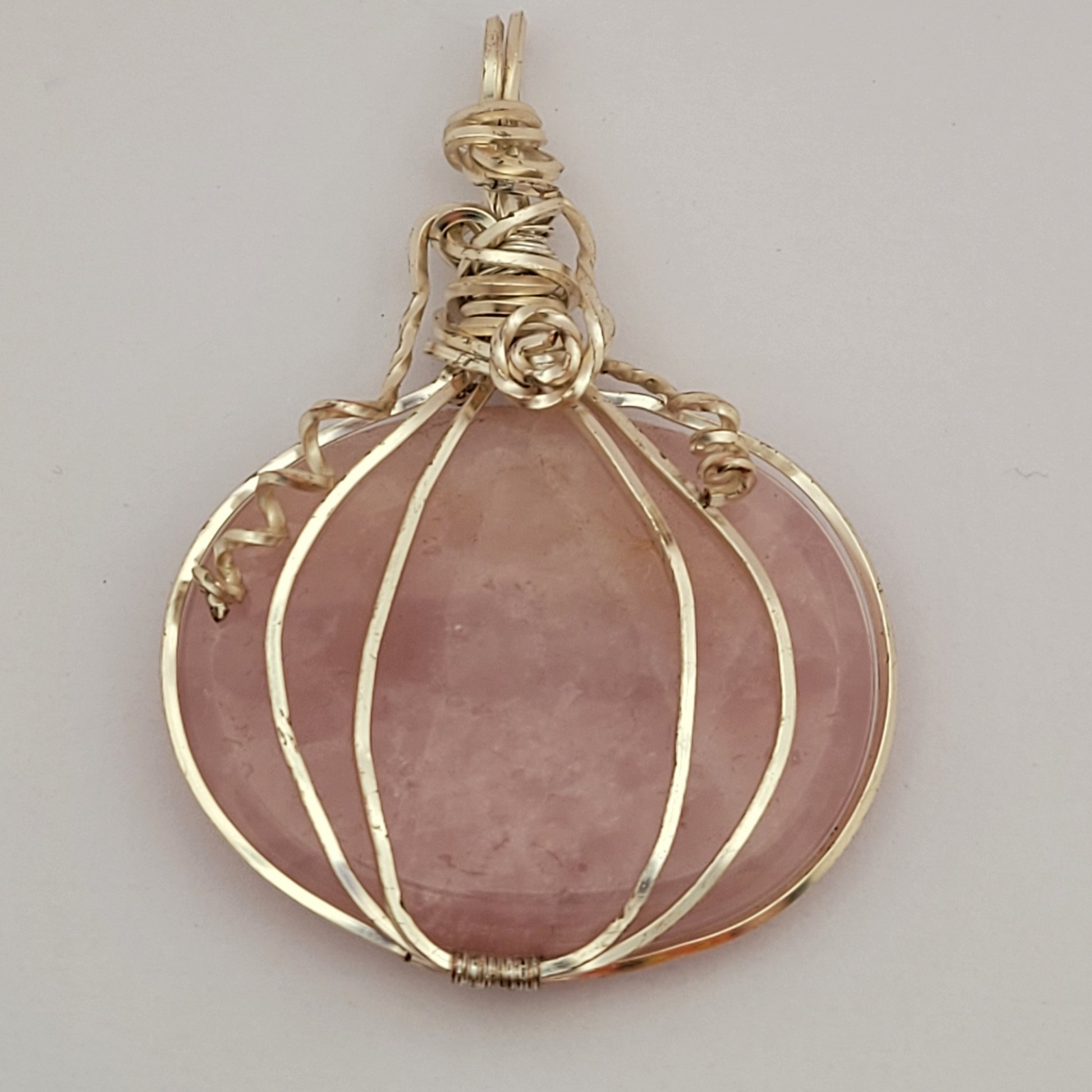 This large, polished Rose Quartz disc is wrapped in structured non-tarnishing square silver wire, with an elegant spiral crown and petal-like cage design. Radiating soft, loving energy, this heart-centered piece is a powerful reminder to lead with compassion—toward yourself and others. A stunning pendant for self-love and emotional healing.
