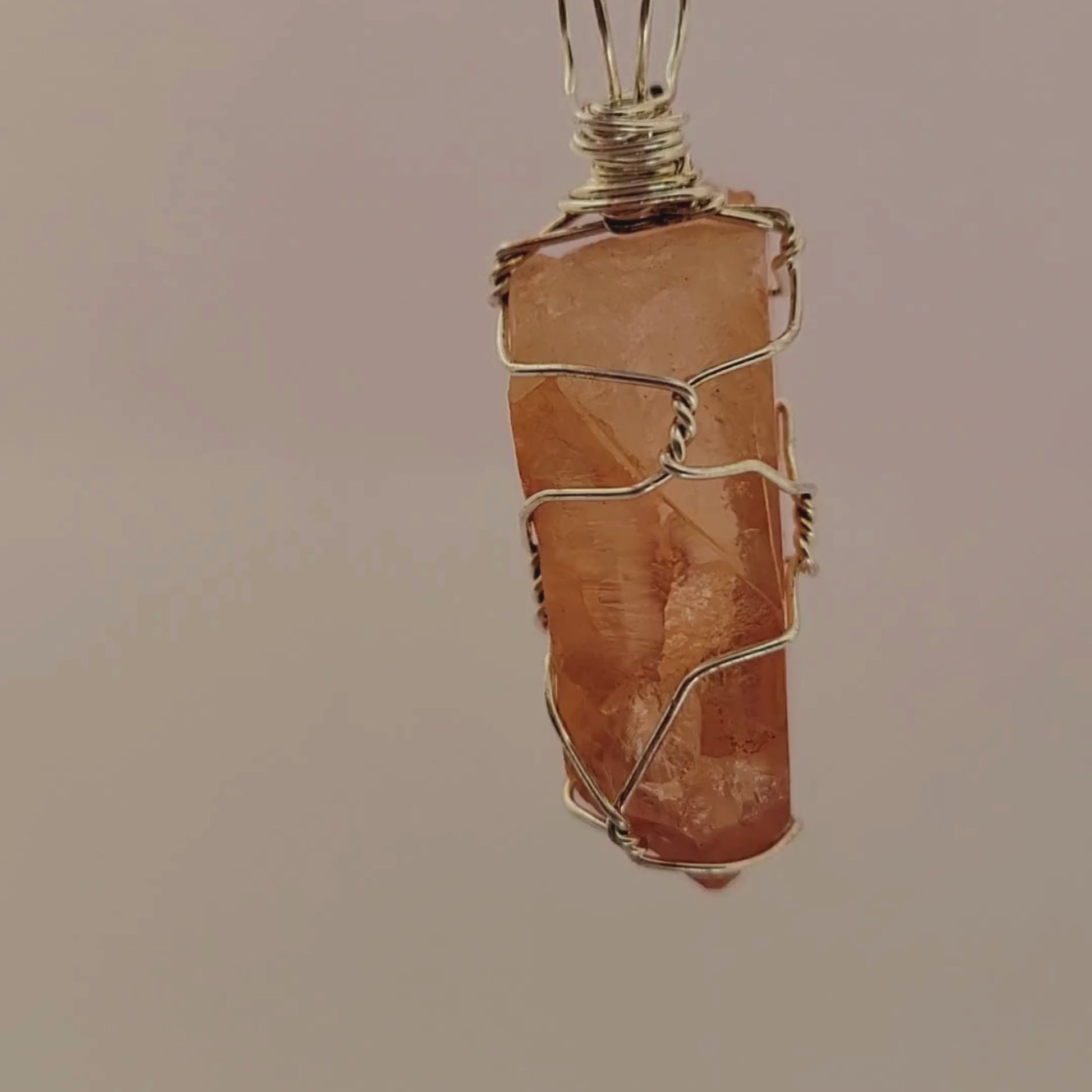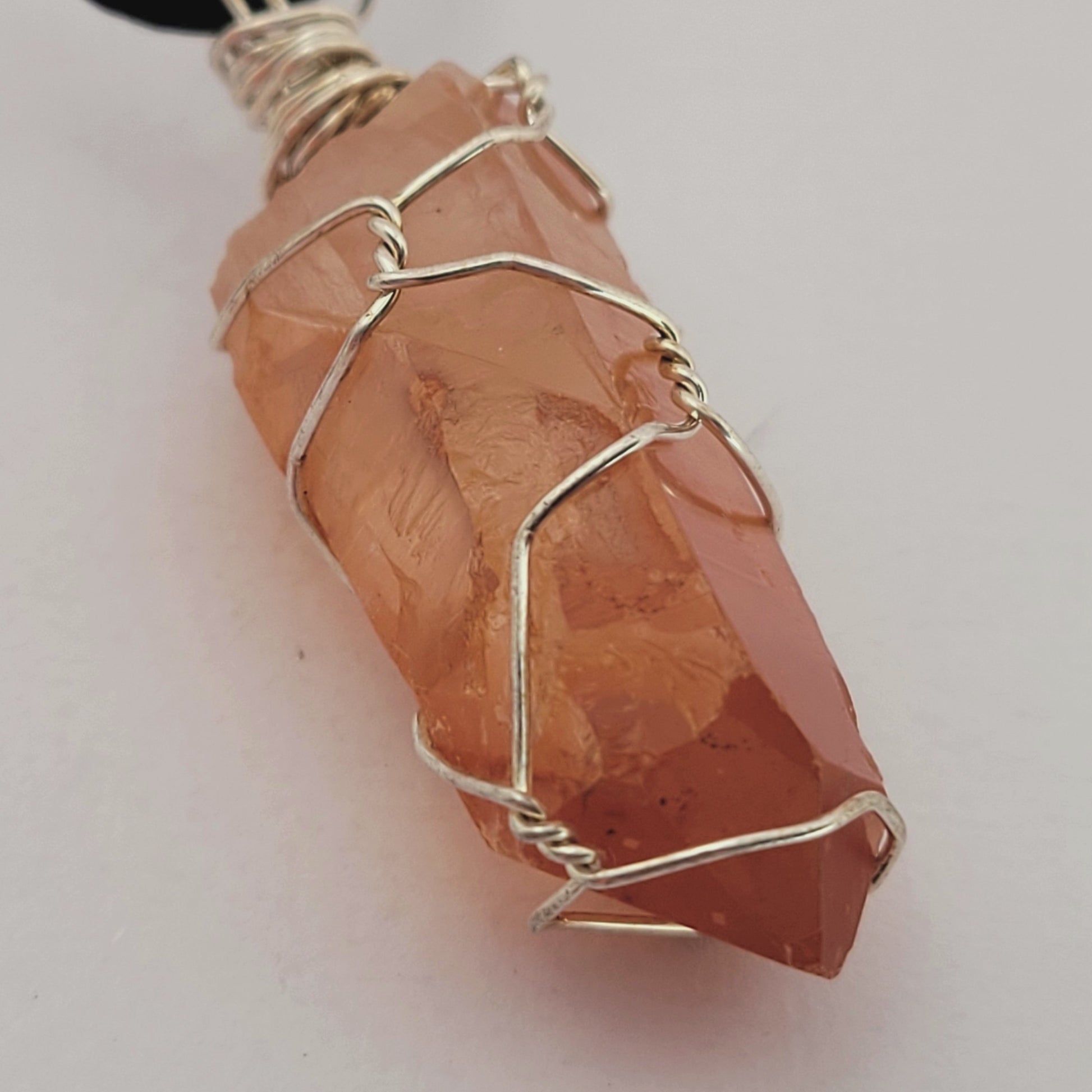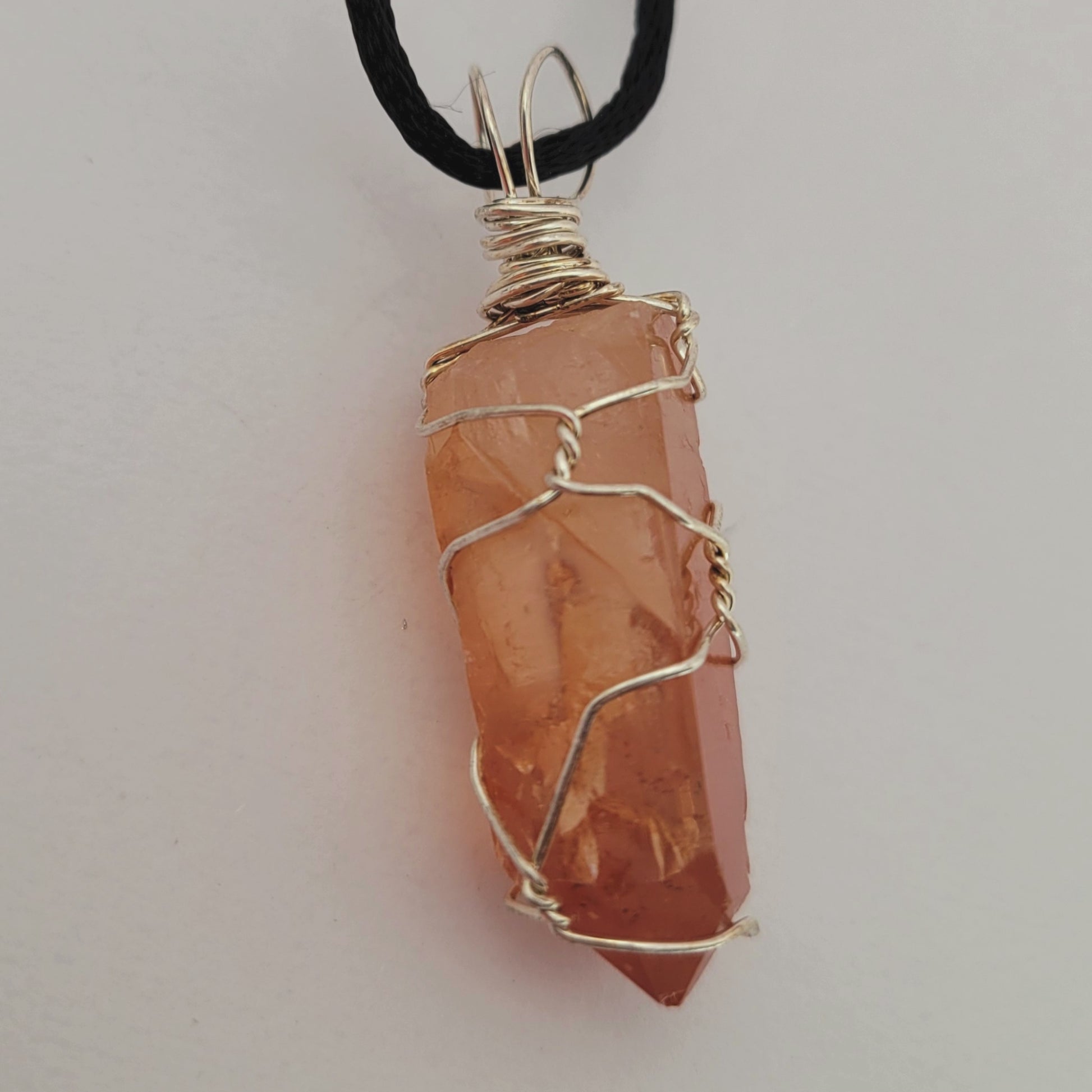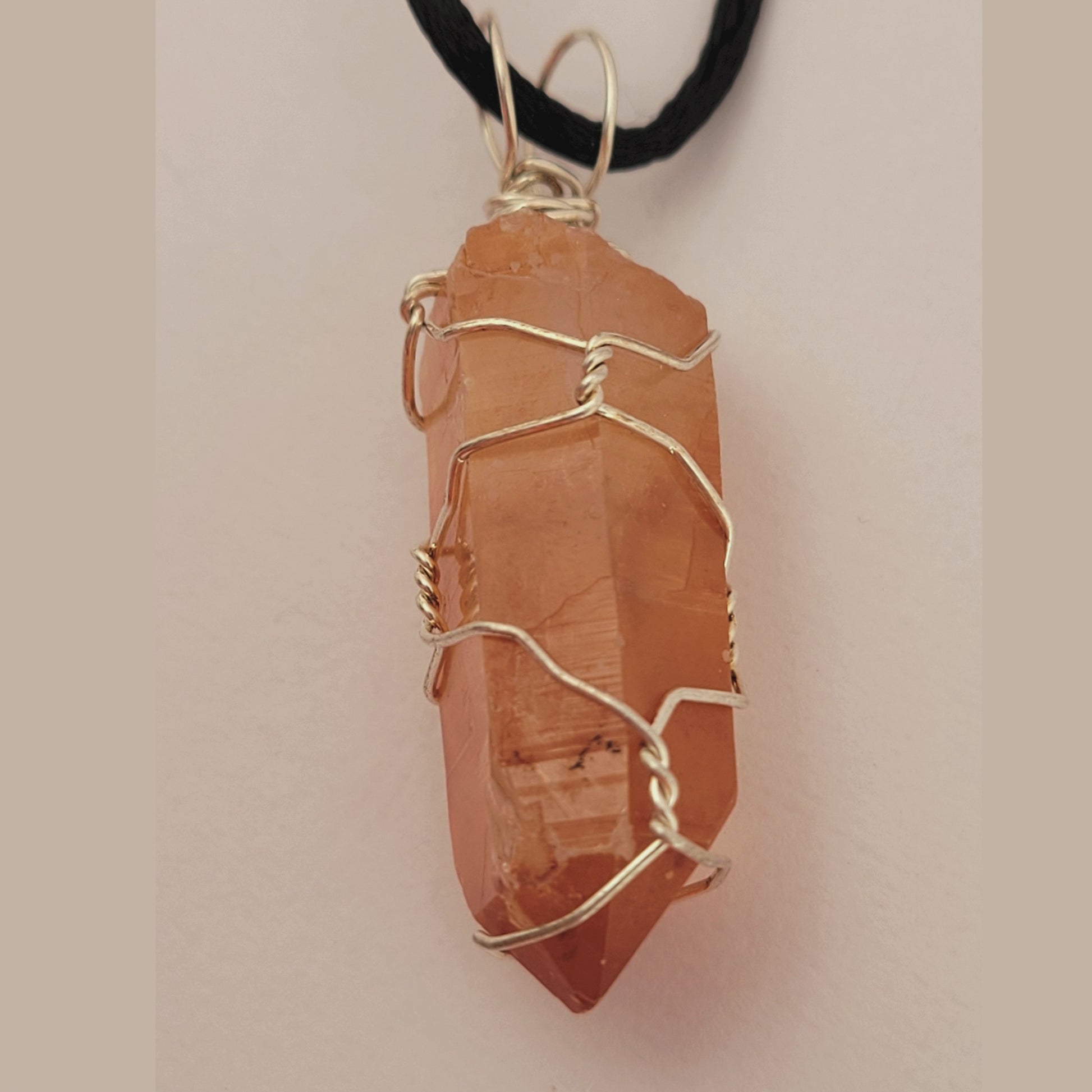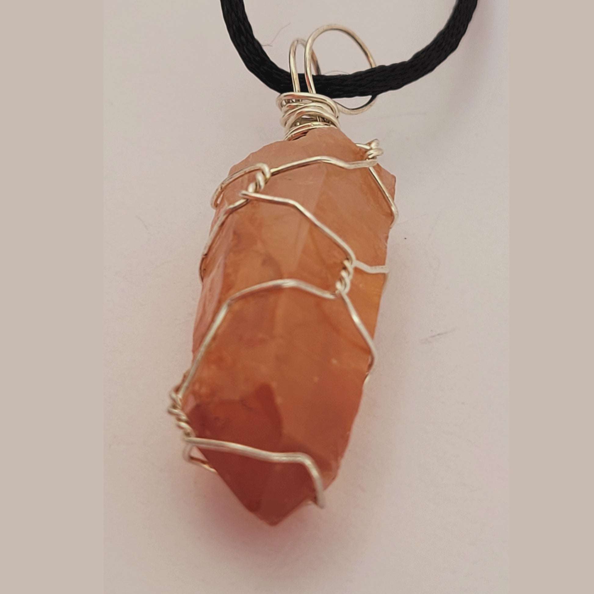 This radiant Tangerine Quartz point glows with warm, energizing hues, hand-wrapped in non-tarnishing silver wire to highlight its vibrant energy. Strung on a black silky cord, it’s the perfect crystal ally for creativity, emotional healing, and bold confidence.