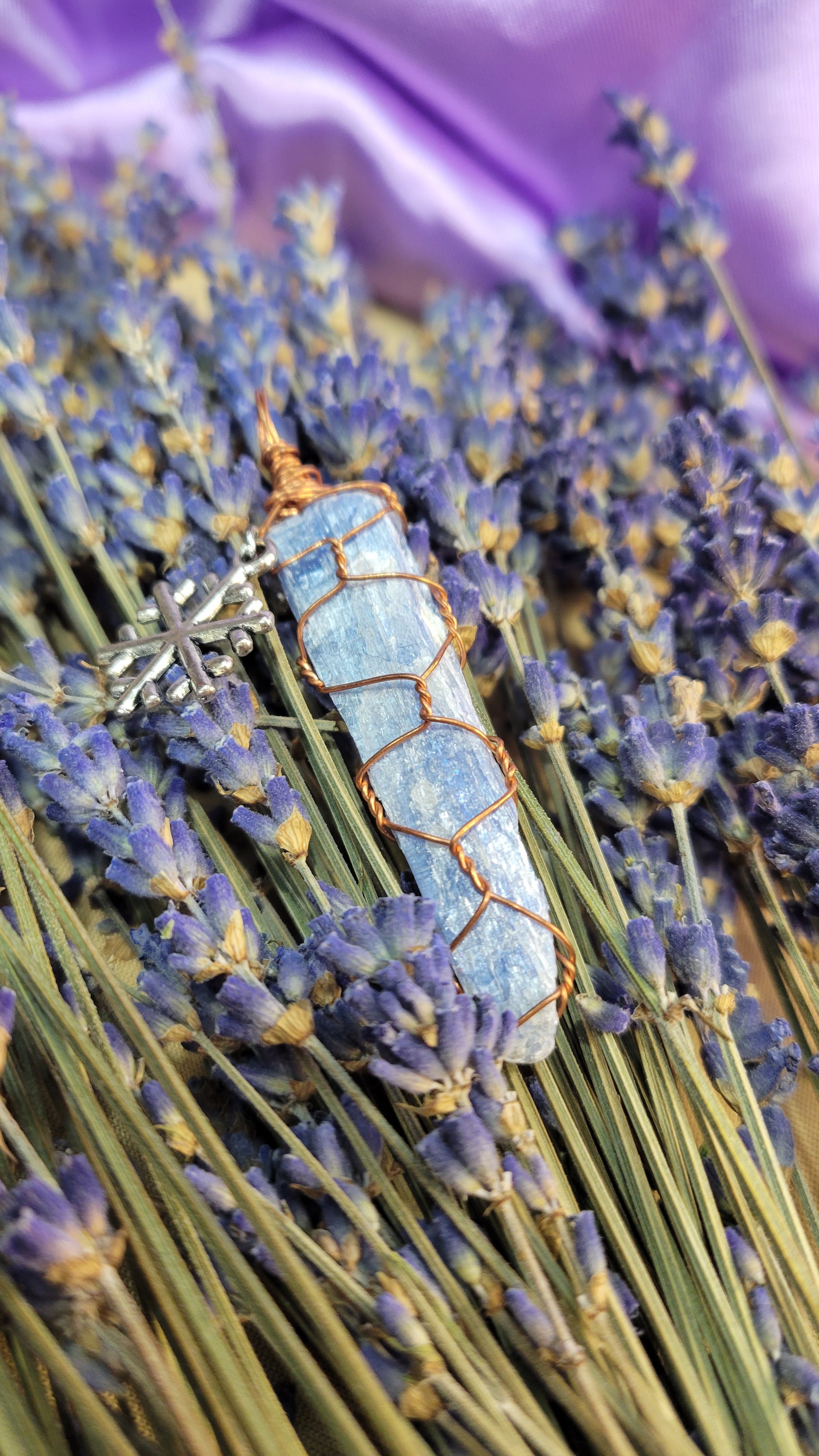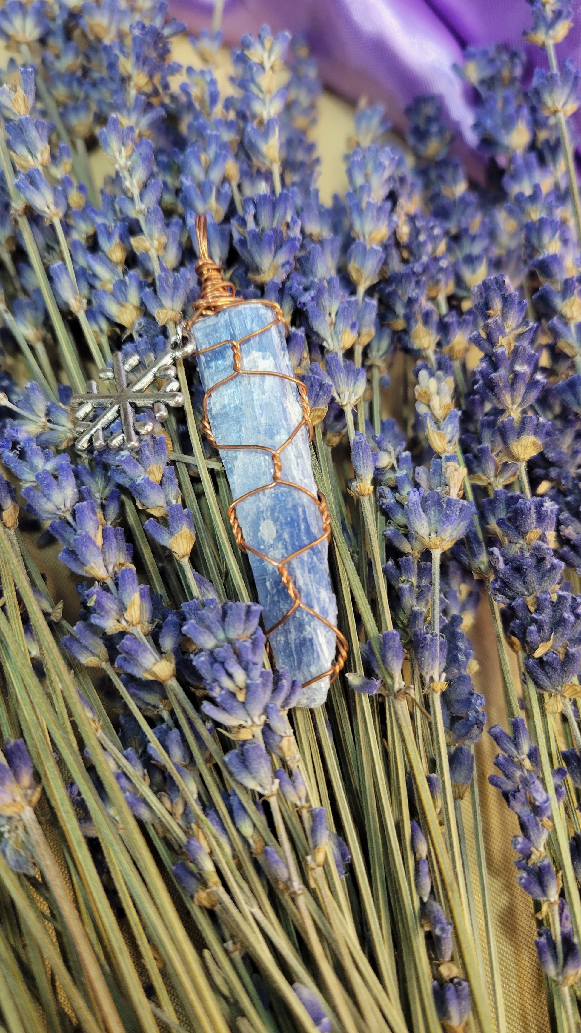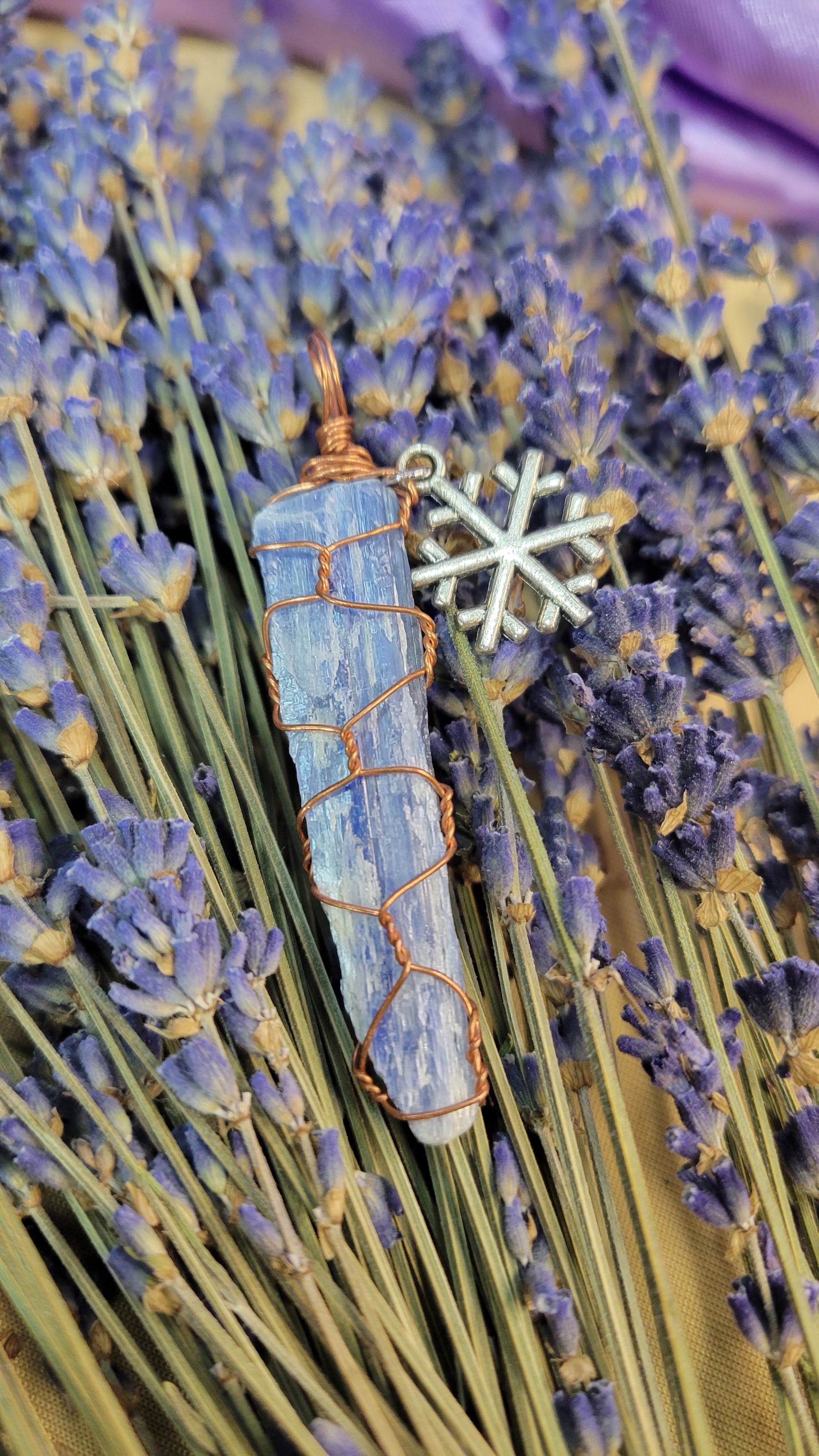 Wire wrapped blue kyanite crystal necklace with snowflake charm